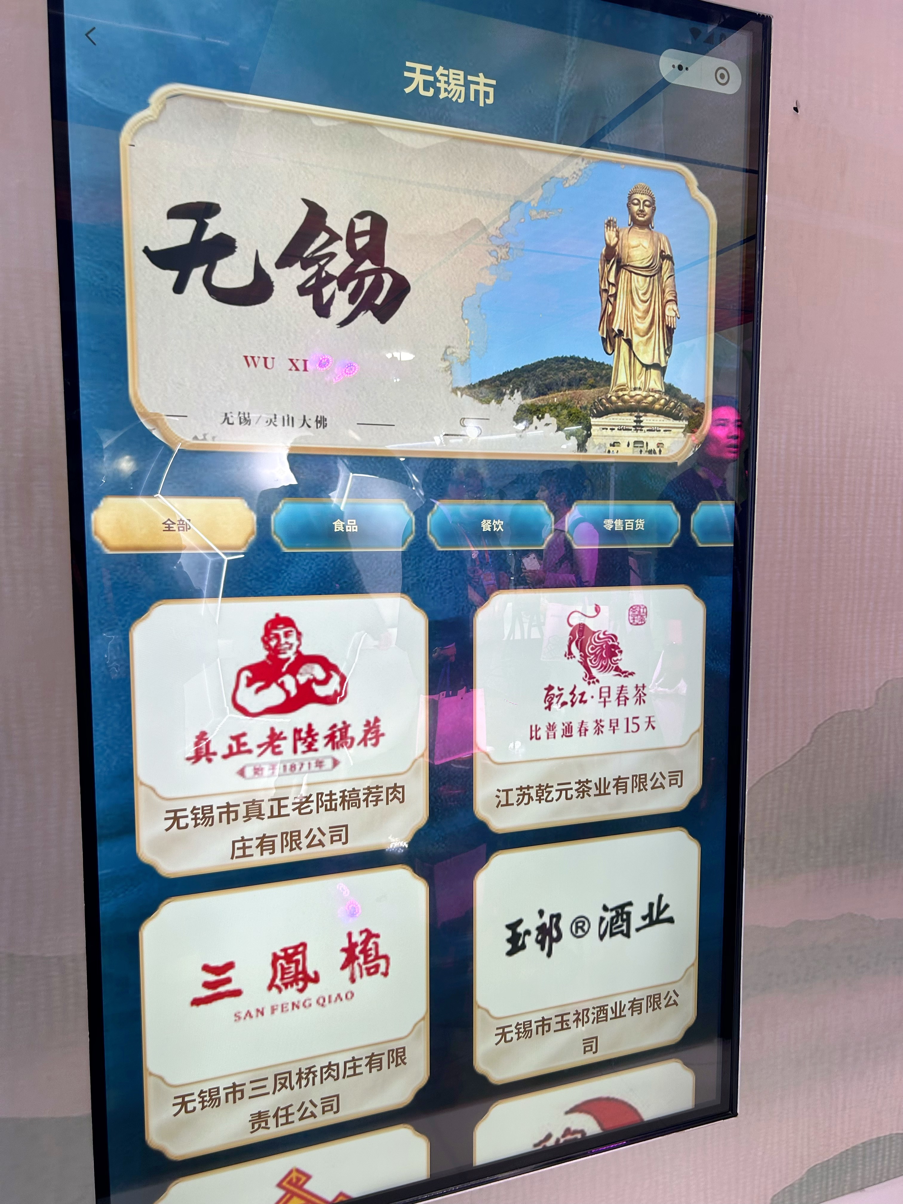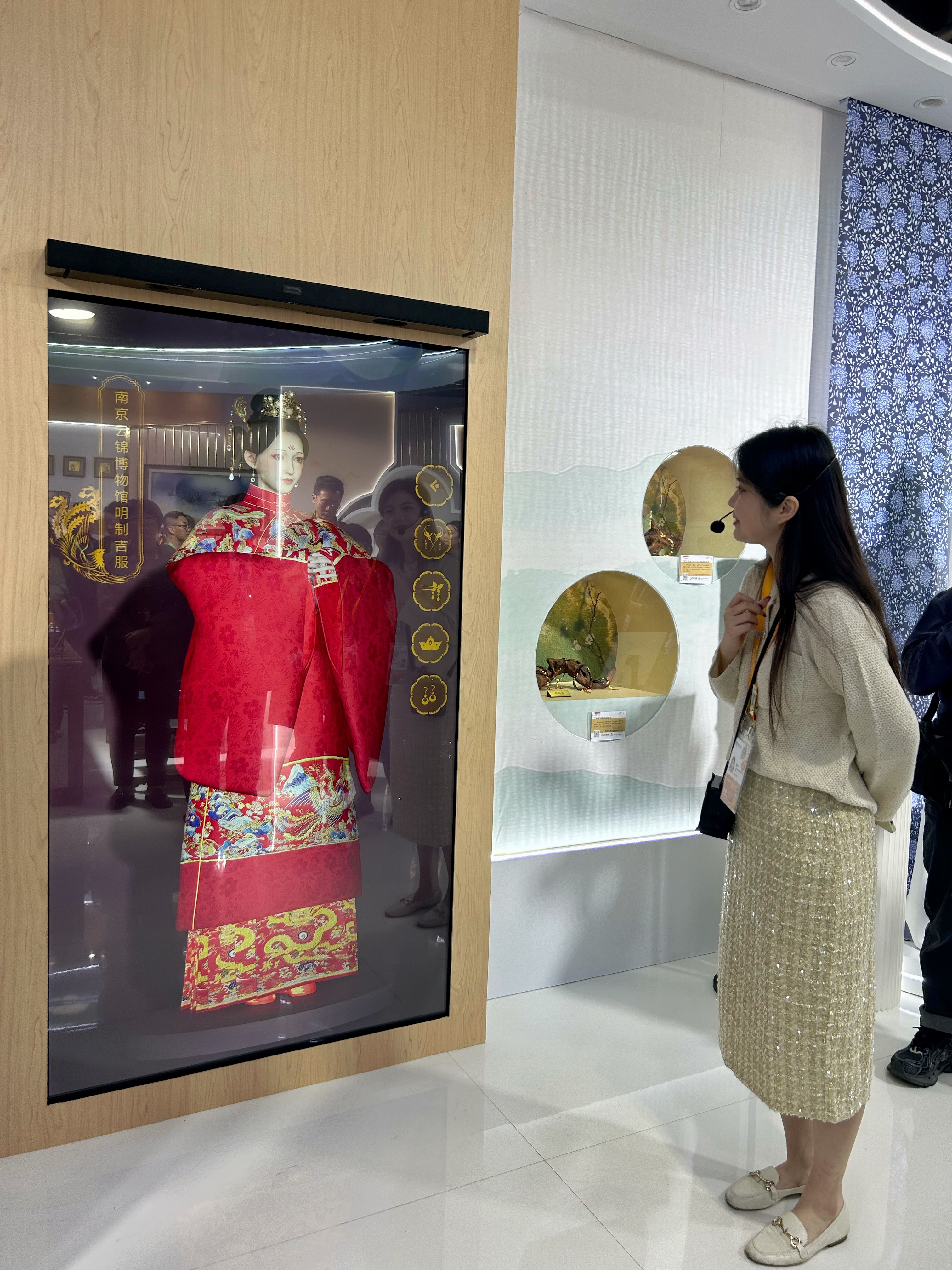 在智慧建设方面,江苏也从未慢下脚步。记者在展区注意到,入口处大屏展示了老字号数字博物馆,可云上点击了解全省352家老字号企业,同时实现购物需求,“线下体验+线上采购”真正无缝衔接。今年展台还首次构建“人机对话+场景互动+云端联动”的多维体验场景,AI数字人“苏小妹”可根据语音指示即可换上云锦吉服、上久楷宋锦、曹裕兴蓝印花布,佩戴子冈珠宝、老天宝等首饰与观众开展互动,且能360度转身展示讲解服饰细节。