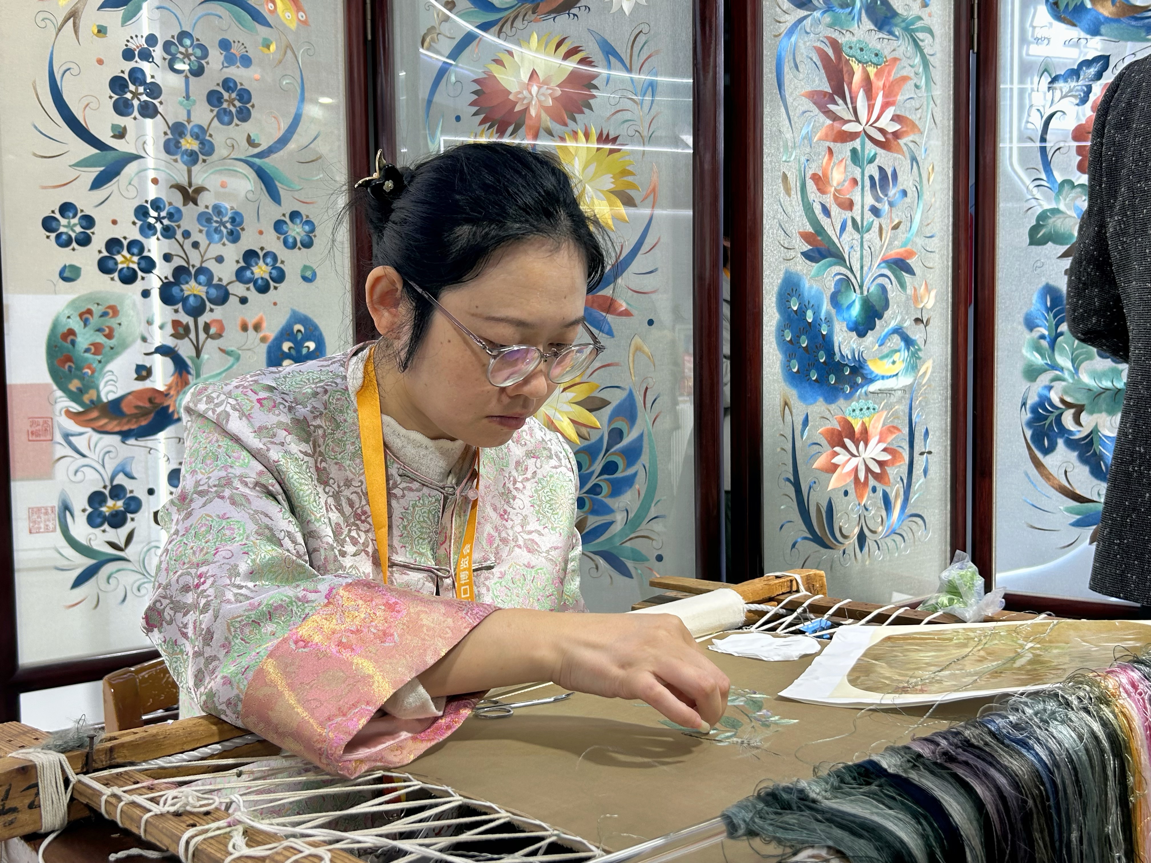 步入展区,苏州刺绣研究所的技艺老师正现场展示“双面异色绣”的精湛技艺:细针带着1/16的丝线上下飞舞,一片深浅不同的绿叶跃然眼前,一面施针却让绣品两面呈现不同图案、色彩与针法。其背后的“四季”屏风虽绣四季之物,色彩和造型却令人耳目一新。