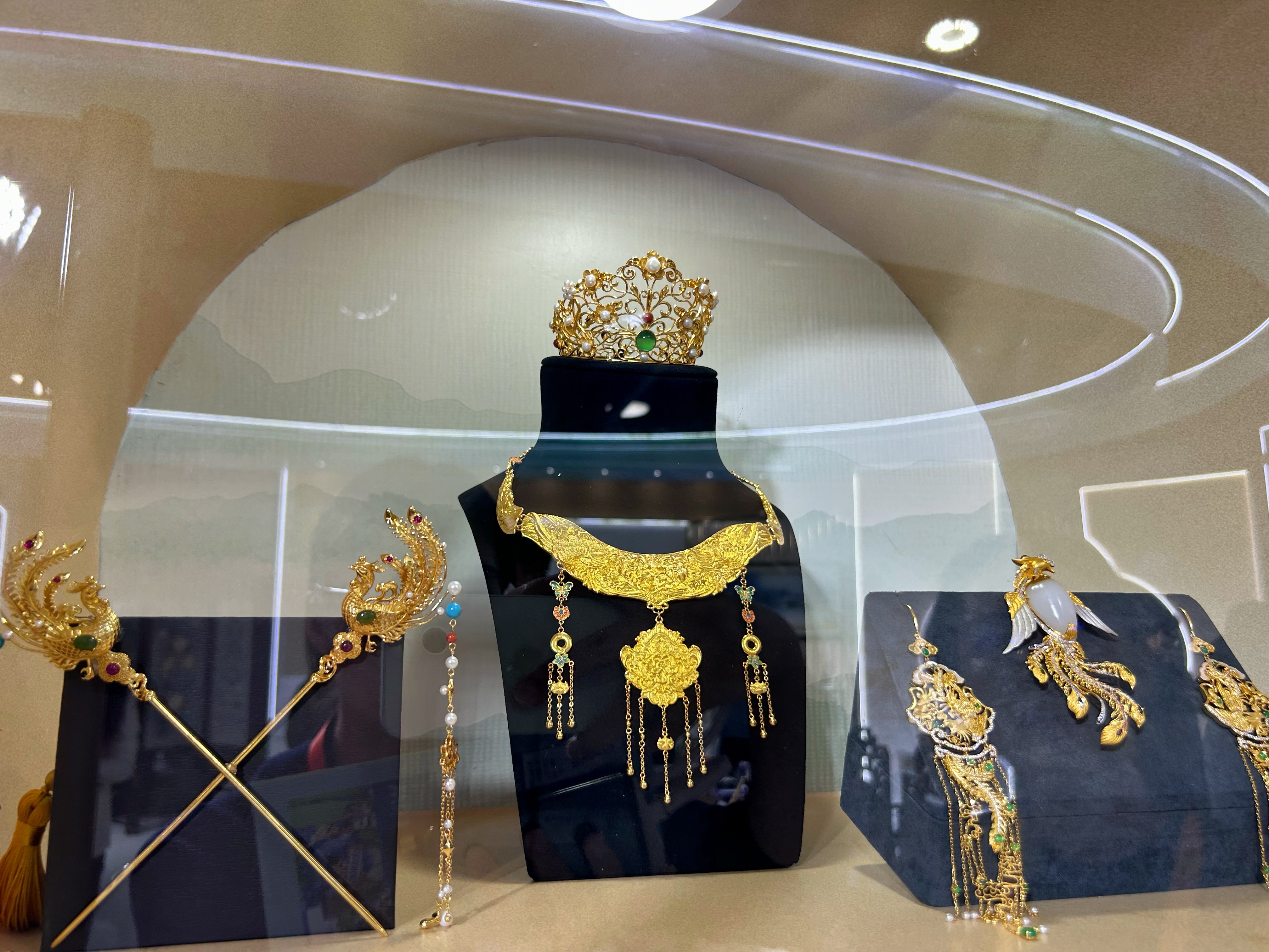 立足传统不断创新,让更多老字号活力倍增。壁龛内,来自子冈珠宝有限公司的花丝镶嵌工艺凤冠、凤钗同样令人惊艳,其以古法鎏金勾掐凤凰轮廓,嵌五彩宝石,深度融合深浅生、紧丝等传统技法,让首饰华贵又不失雅致。公司董事长郭忠华介绍,此次特别准备了“子冈匠心·凤舞簪华新品首饰”在进博会上首发,采用苏州金银细作非遗技艺,包括金银丝细作、失蜡法、镶金嵌宝石、珐琅彩等工艺,让古法黄金更显大气精致。