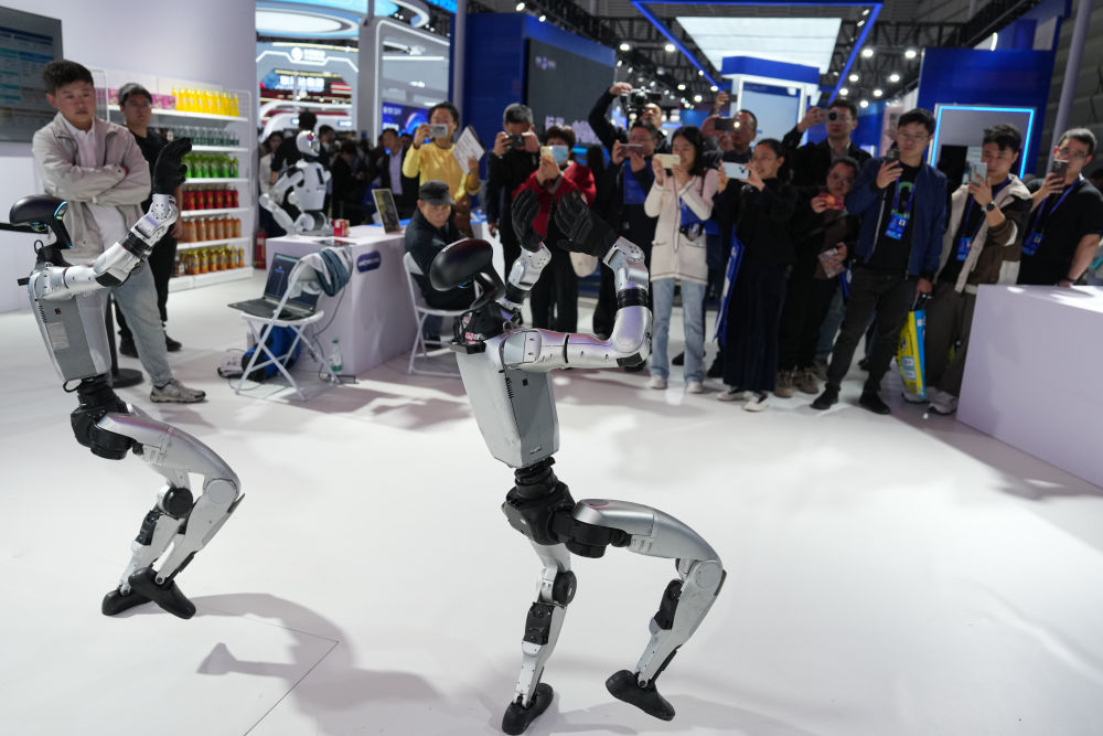 ↑ 11月6日,在2025年世界互联网大会“互联网之光”博览会现场,一家企业工作人员展示人形机器人同步模仿精细动作。新华社记者 黄宗治 摄