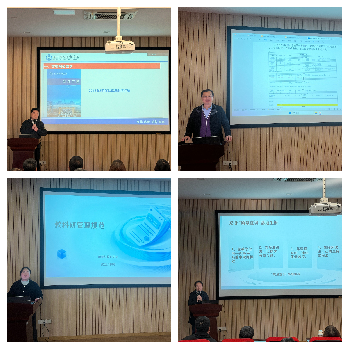 质量与教科研处副处长黄海宁则围绕“树立质量意识、提升质量建设”主题进行深度分享。她强调,教学质量是学校办学的立身之本,全体教师需将质量意识贯穿教学全流程。在质量建设方面,她提出要聚焦课程质量提升,强化教学设计与课堂实效;同时针对江苏省高等职业学校办学能力评价体系中教育教学工作评估展开讲解。