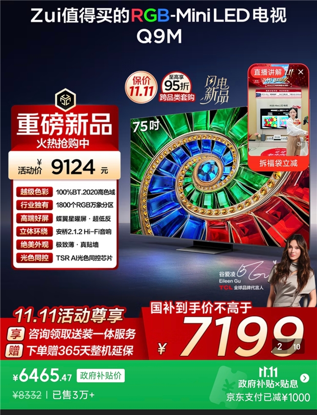 不难看出,Q9M的优势不只是停留在参数上,而是让用户在每个场景都能感受到完美的体验。面对传统RGB电视的色衰、串色、色域虚高等一系列痛点,TCL Q9M用扎实的技术升级显著改善了这些问题,更在音效、性能和智能体验上为用户带来惊喜,让影视爱好者到游戏玩家,乃至家庭用户等不同需求的人都能在它身上找到满意的使用感受,更关键的是价格诚意十足,双十一期间日常售价9124元的Q9M 75英寸版本,到手价仅为6465元,对比起同价位机型,这份全面的体验升级显得格外实在。若你刚好在万元内预算里寻找一款全能靠谱的RGB-Mini LED电视,TCL Q9M绝对是一个值得认真考虑的对象。