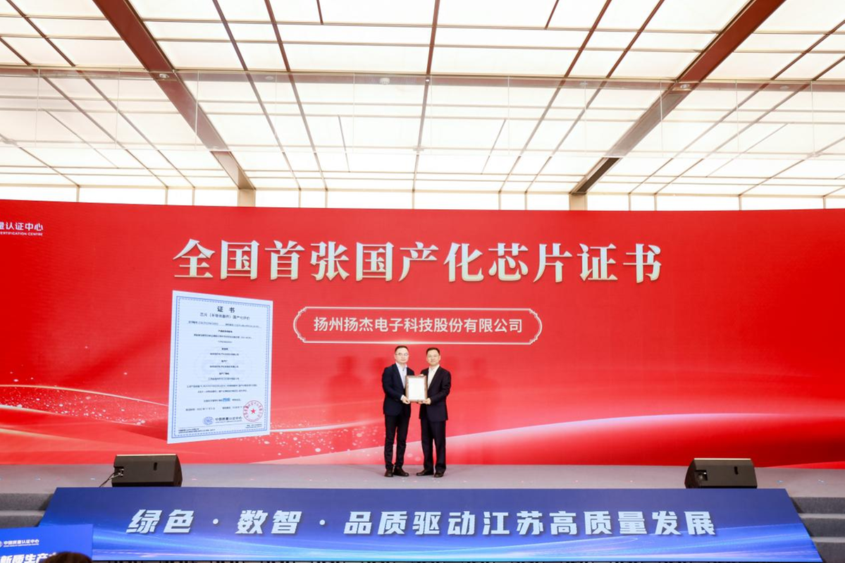 新华日报财经讯 11月6日,2025(第二届)认证赋能江苏高质量发展大会在南京举行。会上,中国质量认证中心(CQC)为扬州扬杰电子科技股份有限公司颁发全国首张国产化芯片证书,意味着该公司在功率半导体器件领域实现了从设计、制造到封装测试的全链条自主可控。