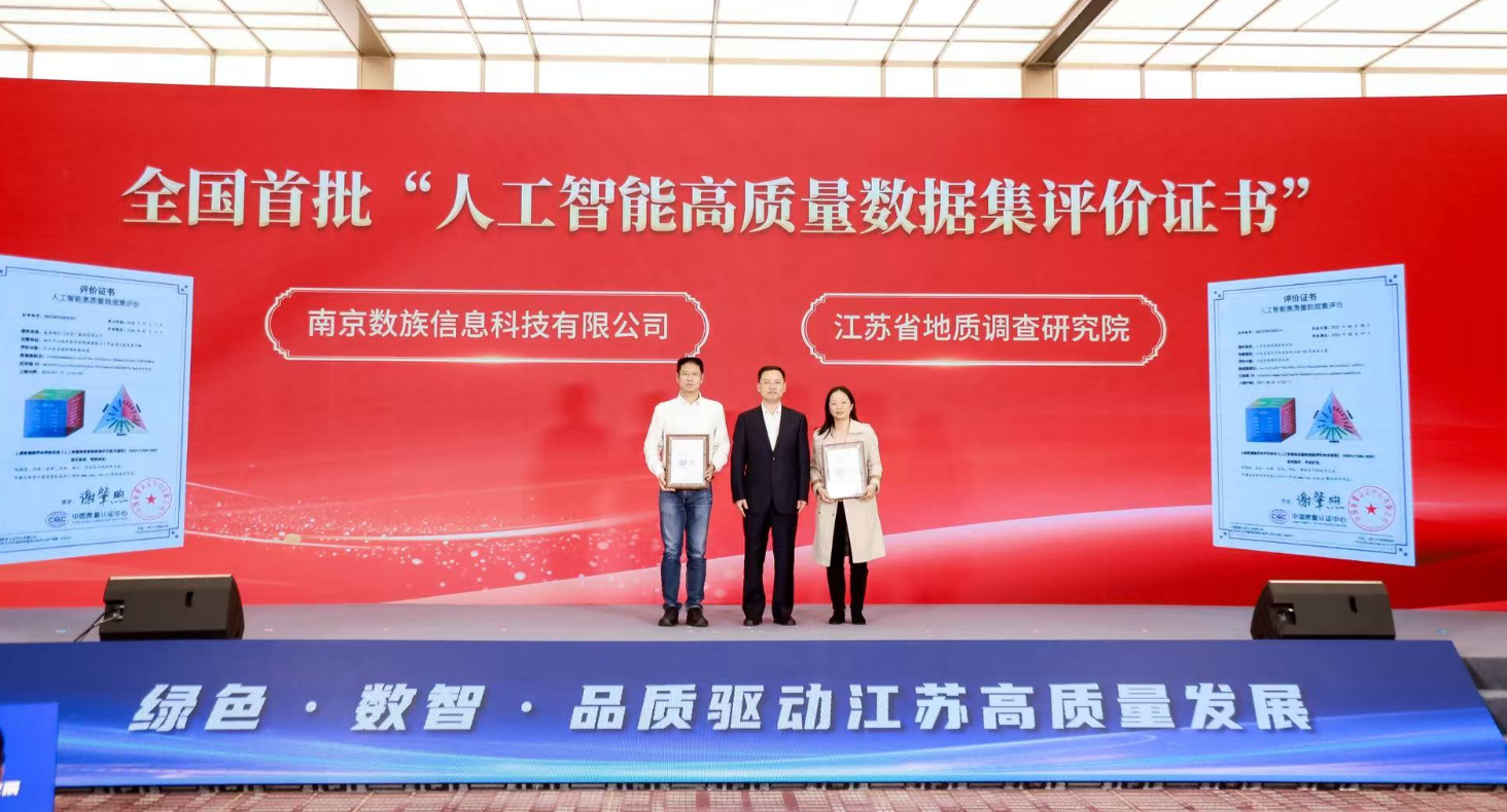 全国首批“人工智能高质量数据集评价证书”颁发给了两家江苏企业,南京数族信息科技和江苏省地质调查研究院。