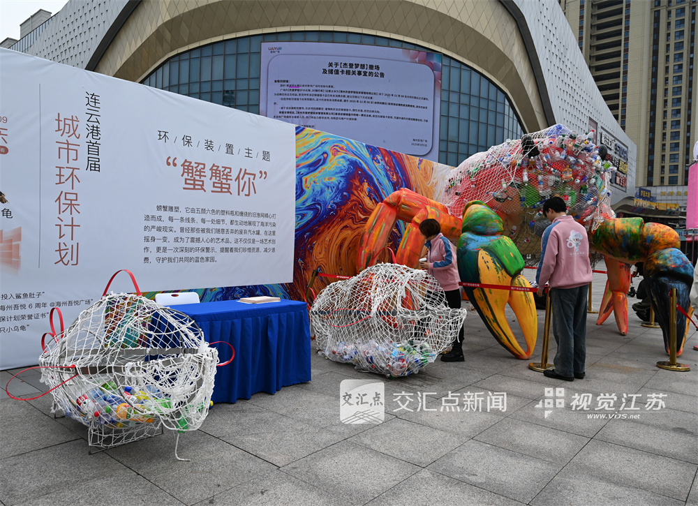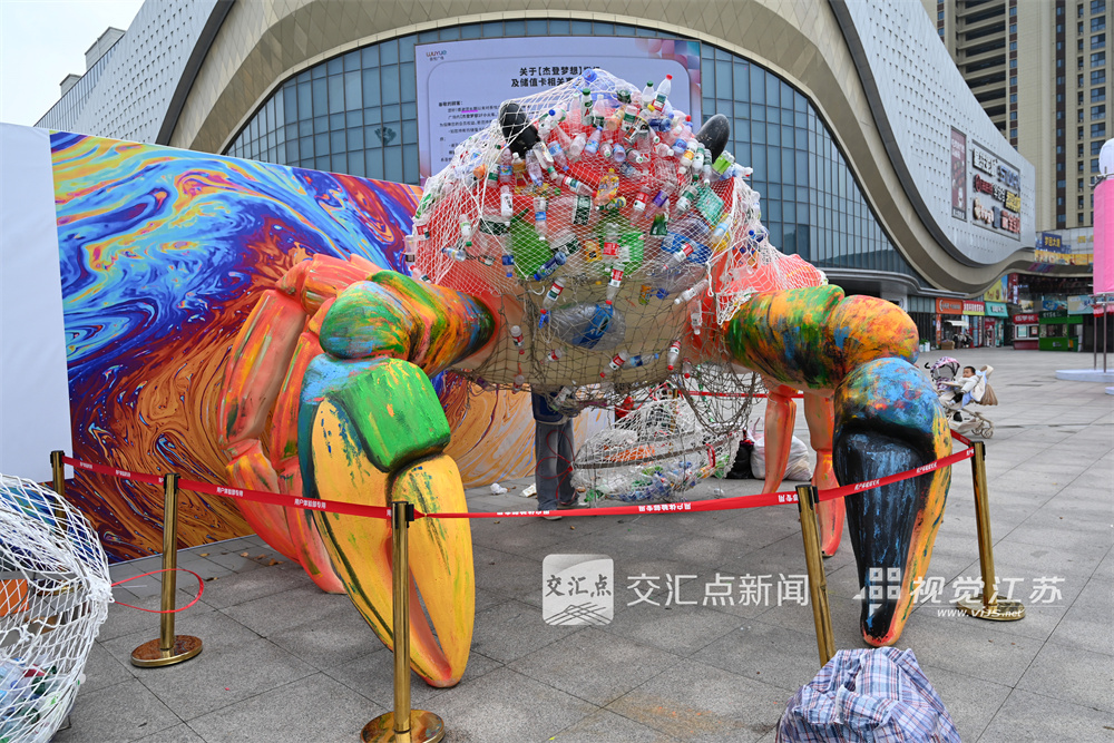 现场以废弃塑料瓶和旧渔网制作的螃蟹雕塑引人注目,生动揭示海洋污染问题。用废弃汽水罐等物品变身艺术展品,传递环保理念。