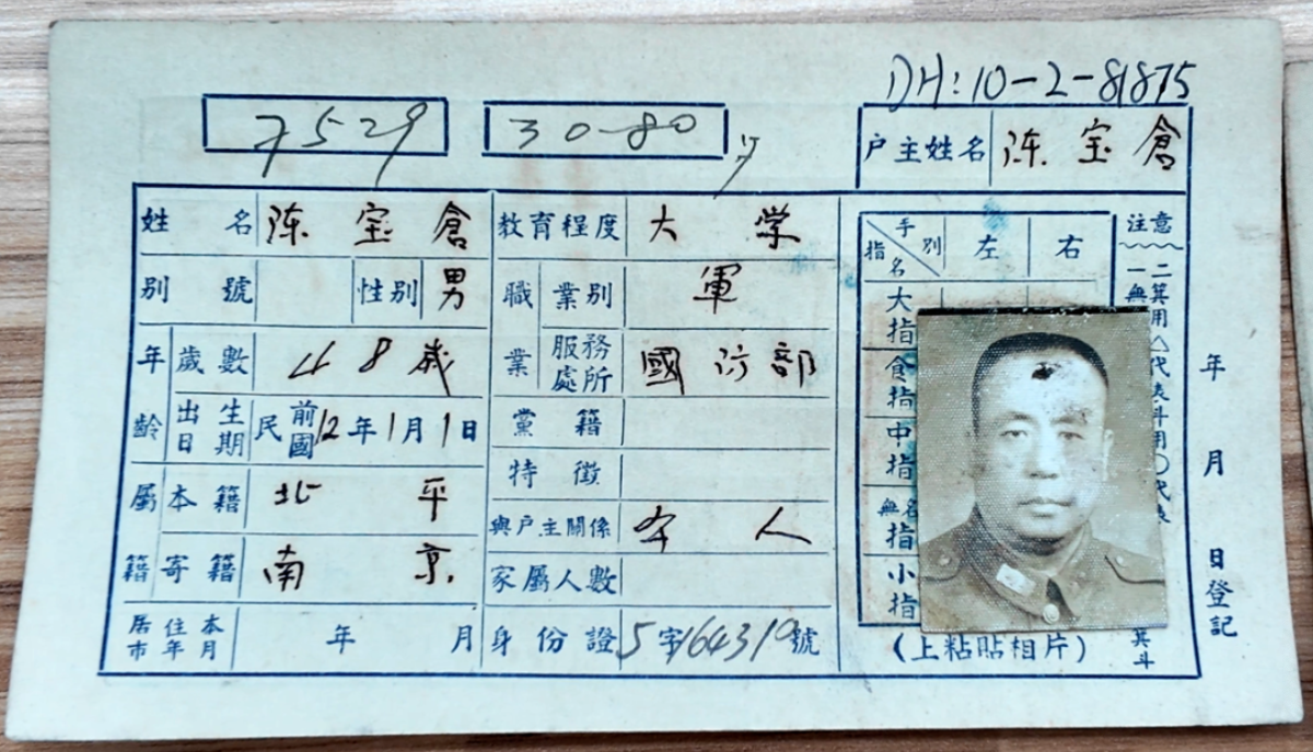 陈宝仓的户籍卡显示其当时48岁,“服务处所”为“国防部”,住所为“丰富路342号”。