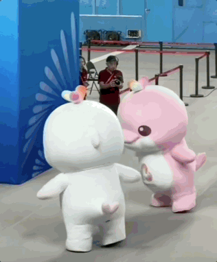 这两只萌物的头顶可不是“鸡冠”,而是三色浪花,融合了广东木棉红、香港紫荆紫和澳门莲花绿,分别代表广东、香港、澳门三个联合承办本届赛事的地区。从正面看,这三色浪花还构成了一颗爱心的形状❤️,寓意着三地同心;而为海豚添上手和脚,是为了更好表现运动姿态与动态美感。