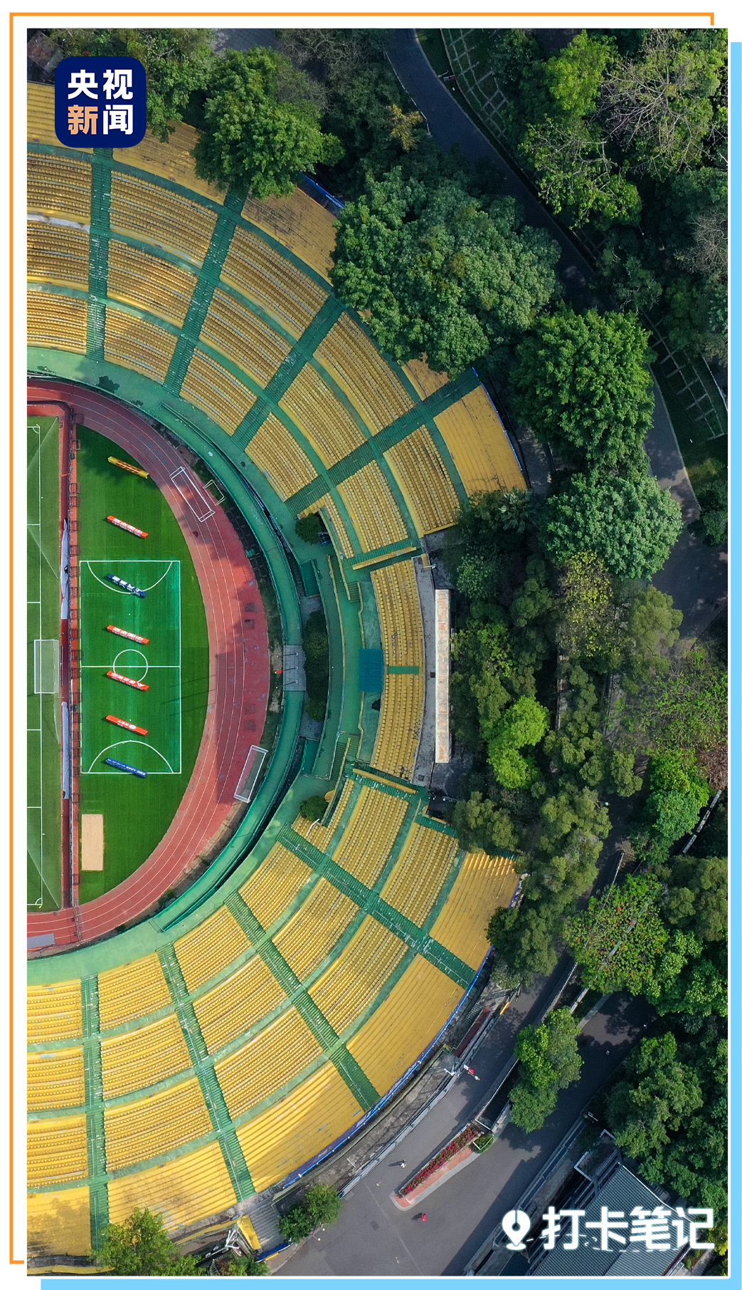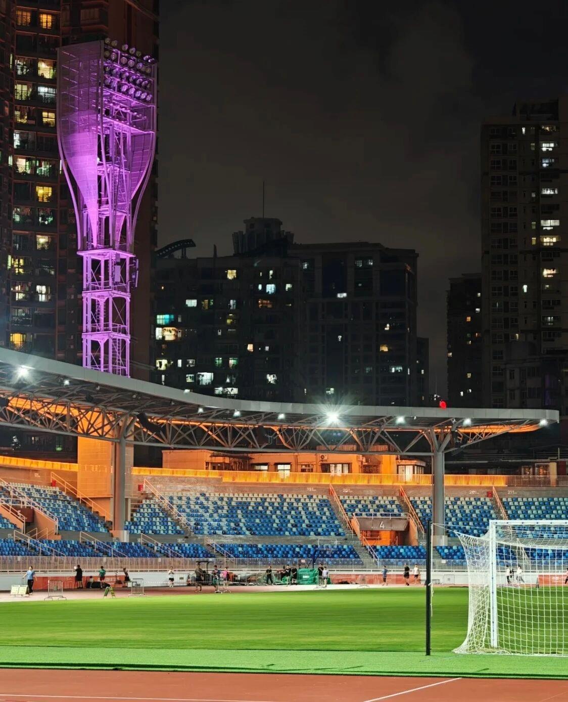 改造后的越秀山体育场颜值拉满:渐变黄座椅、深绿挡墙、天蓝跑道、绿茵场,复古的撞色很有质感,随手一拍都是怀旧大片!