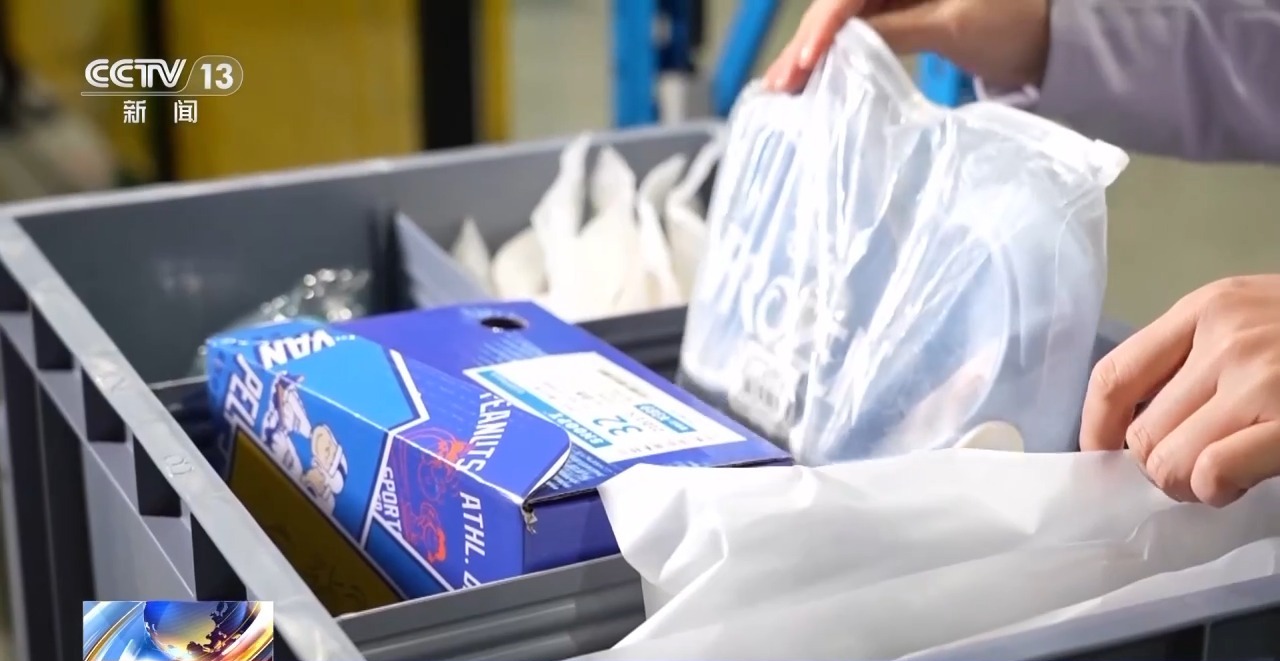 记者采访了分拣区的工作人员,他们说如今机器人送来的料箱里,居然可以实现一筐多品。像这个物料箱里就装着儿童拖鞋、儿童运动鞋和冬季棉帽,这背后的关键是超脑运算下的智能分拣。每个料箱自带专属编码,可以实现定位,搭配可分区的凹槽面板,让不同品类商品“混搭”存储成为可能。