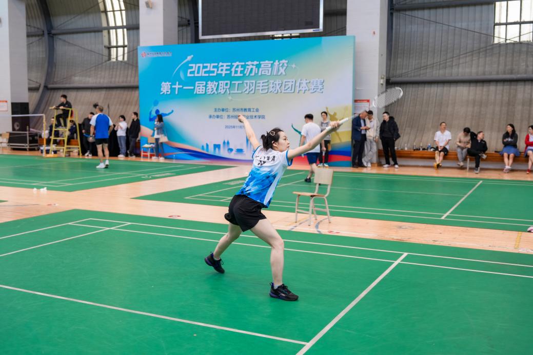 11月7日,由苏州市教育工会主办的2025年在苏高校第十一届教职工羽毛球团体赛在苏州经贸职业技术学院拉开了帷幕。苏州市教育局工会主席、副主席等参加开幕式,在苏高校的15支代表队近200名在苏高校教职工齐聚赛场,以球会友,以拼搏诠释体育精神,共同完成了一场充满活力的羽球盛会。