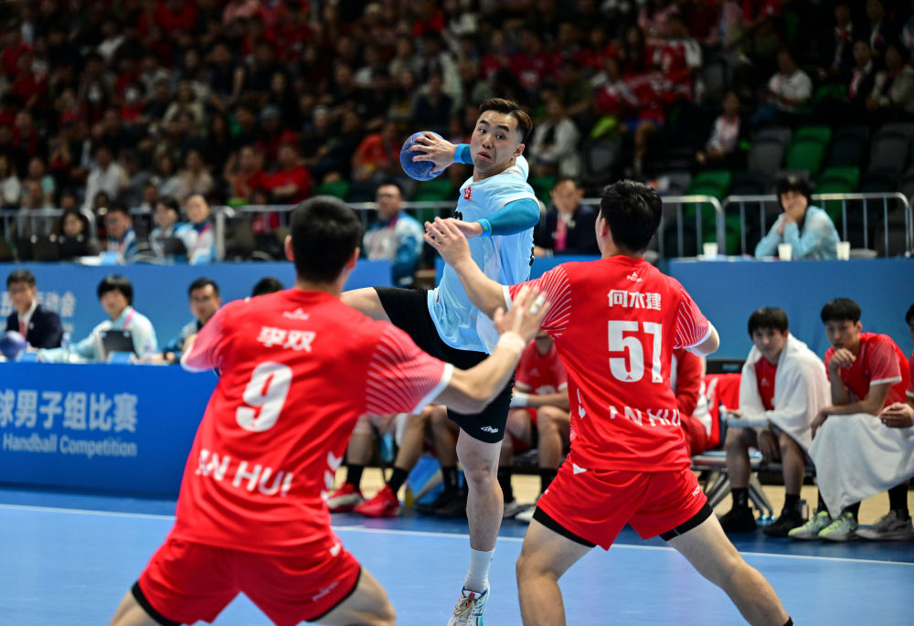 ↑11月8日,在香港进行的第十五届全国运动会男子手球半决赛中,香港队球员连润滔(中)在比赛中射门。新华社记者 于洋 摄