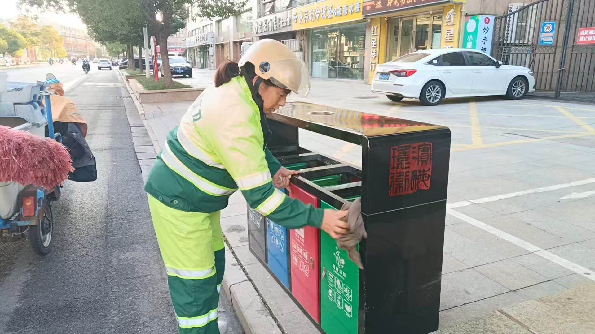 重点对主要道路沿线、住宅小区外围破损陈旧的果壳箱、垃圾桶等进行维护更新,累计更换港城路、人民北路、人民南路等县城主干道陈旧果壳箱110套、维修损坏部件170余处,规范出新垃圾分类标识400余处。采取“洗桶车清洗+人工冲洗”相结合的方式,对沿街沿路400余只垃圾桶进行清洗,对300余处垃圾收集点周边场地进行高压冲洗。对住宅小区外围建筑退让红线范围内的桶身破损、外观脏污、垃圾分类标识错误的垃圾桶,会同住建部门督促小区物业及时进行更新或维修,累计更新、维修垃圾桶110余只。