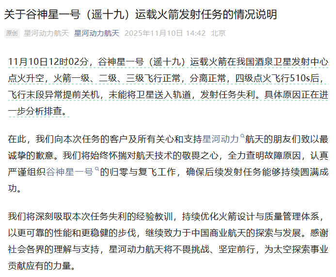 10日,星河动力航天微信公众号发布情况说明: