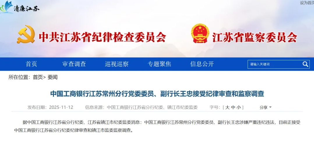据江苏省纪委监委官网11月12日援引中国工商银行江苏省分行纪委、江苏省镇江市纪委监委消息:中国工商银行江苏常州分行党委委员、副行长王忠涉嫌严重违纪违法,目前正接受中国工商银行江苏省分行纪委纪律审查和镇江市监委监察调查。