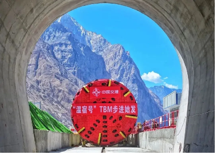 中交天和自主研制的两台刀盘直径8.83米、总长235 米的 TBM“昭苏号”和“温宿号”,从西天山昭温隧道两端对向掘进。在82.3%岩爆地层和极端环境下,“昭苏号”和“温宿号”采取“敞开式+单护盾双模式”设计,配置超前地质预报、岩爆探测、超前探水、可扩挖刀盘、多层次注浆系统等世界先进技术,采用“仰拱块铺设+常规支护”新型工法,掘进效率和安全系数大幅提升。