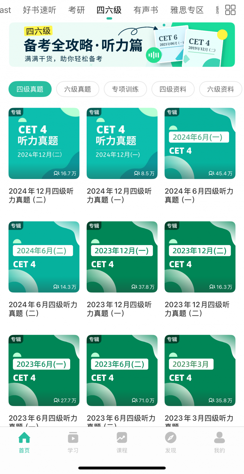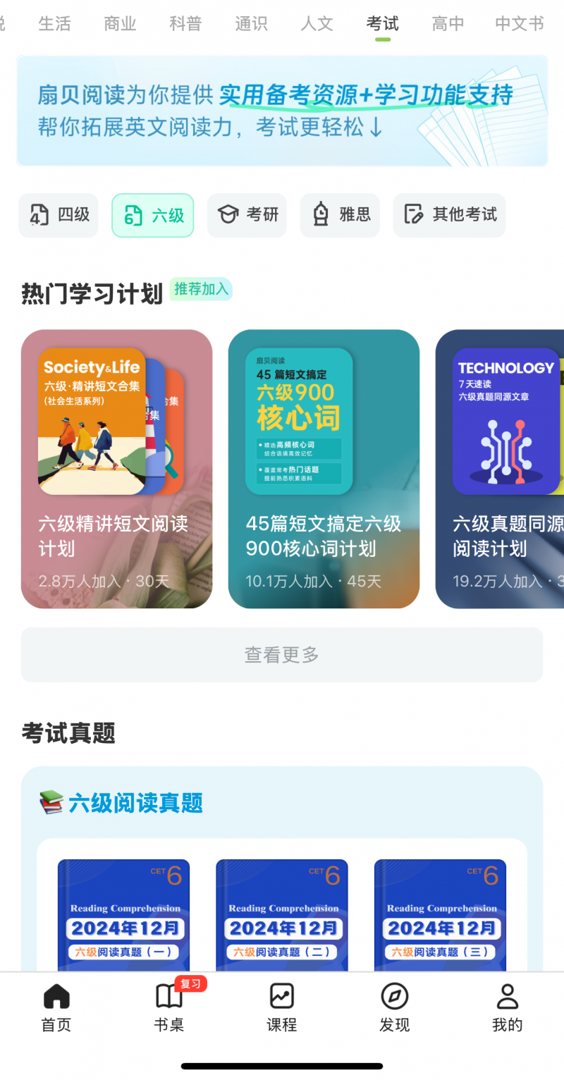 与扇贝阅读、扇贝听力口语数据联动,背完单词可直接跳转刷四六级真题原文、练习真题听力。