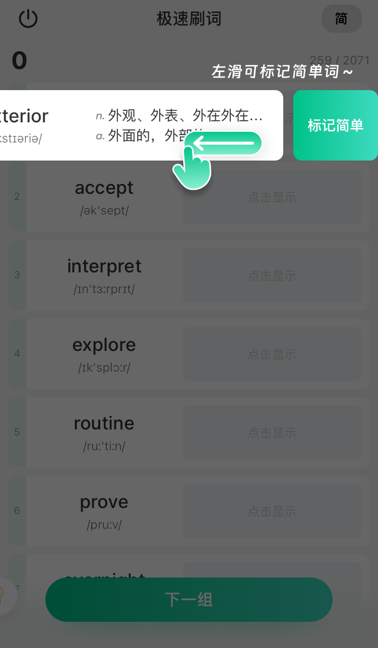“极速刷词”功能专为想要快速刷词过词书的用户开发,提供单词列表,会的一键标记,不会的标记以后复习,支持1分钟快速刷10词,精准聚焦薄弱项,适配食堂排队等碎片场景。