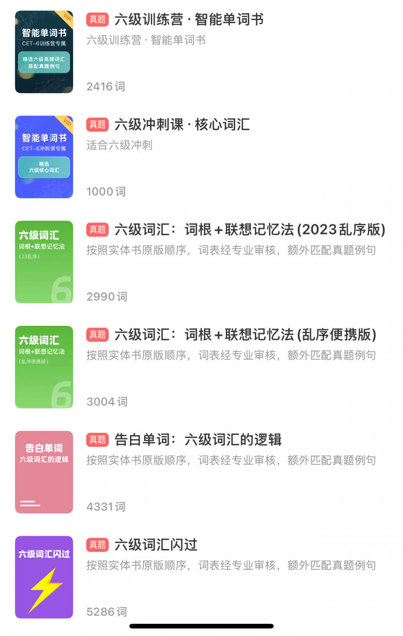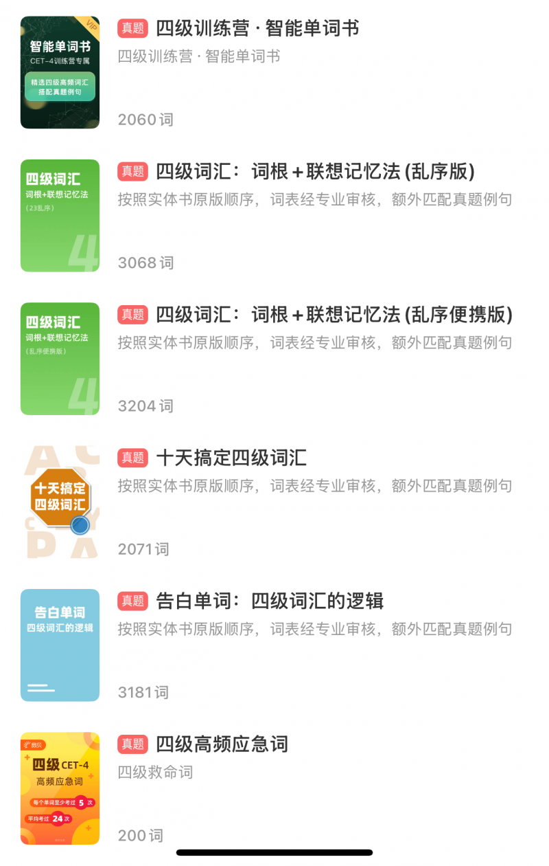 内置四六级考纲词、高频核心词等基础词表,同时完美适配《红宝书》《词根+联想》《闪过》《告白单词》等热门纸质单词书。