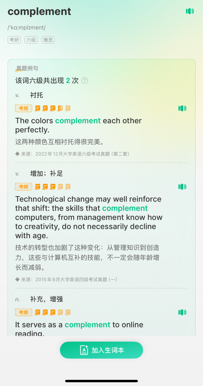 收录近11年四六级真题数据库,为每个单词匹配真题原句,解决“孤立背词不会用”的问题。专业团队拆分单词不同考义并标注考频,明确不同题型中的释义差异。
