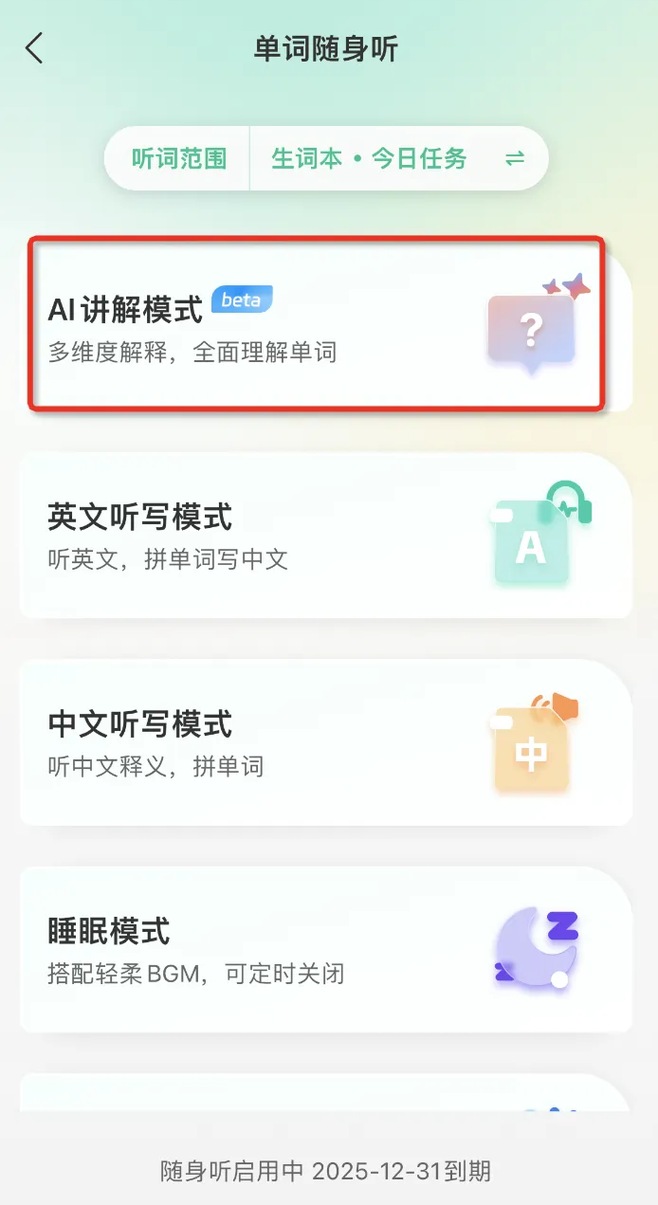 “单词随身听”功能支持AI讲解、听写、睡眠等多种模式,可在睡前、走路等场景磨耳朵,强化听觉记忆。