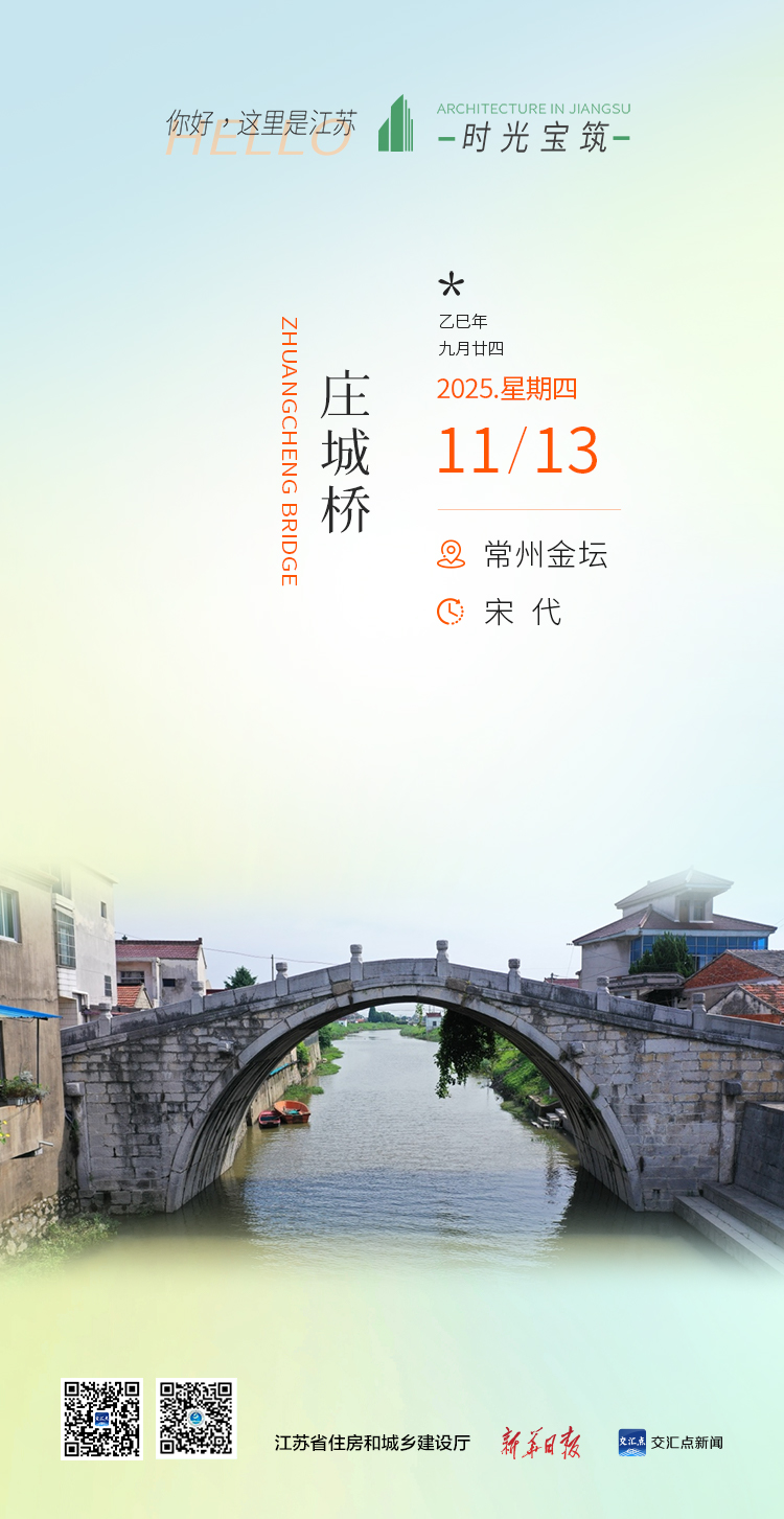 庄城桥位于常州市金坛区庄城街西首,为单孔石拱桥,东西走向横跨庄城河,是江苏省内少见的宋代石桥。桥身以青石分节并列砌筑,桥面长37.4米,净跨12米,望柱雕覆莲纹,桥耳饰如意纹,具典型宋代风格。桥面设独轮车道,中心嵌莲瓣纹石,结构精巧,至今仍在使用。