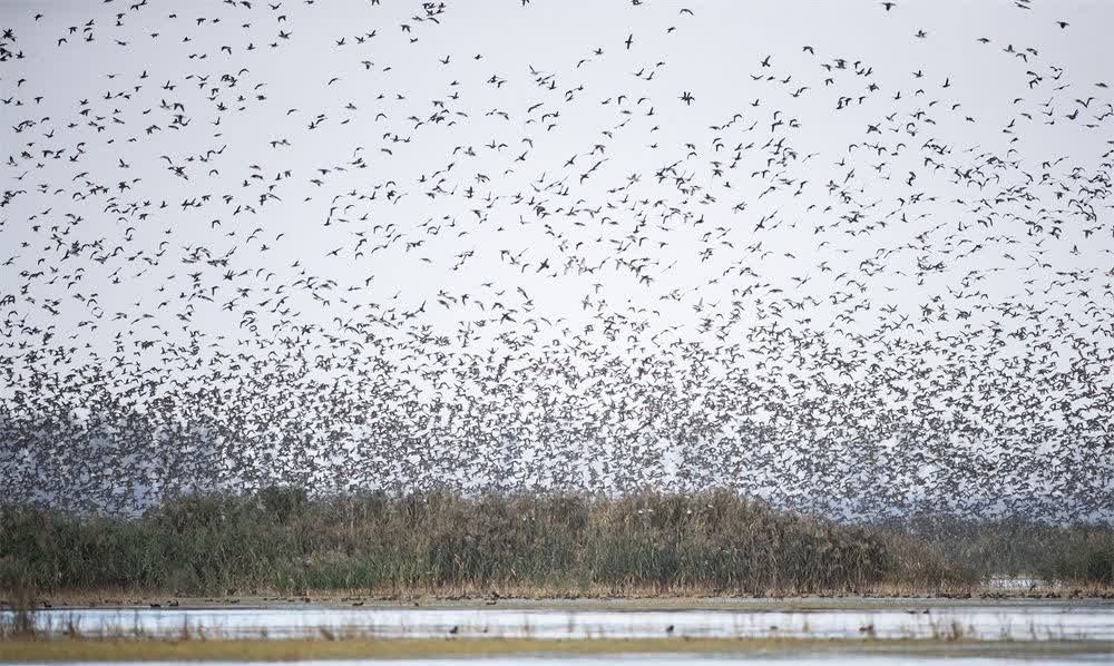交汇点讯 江苏泗洪洪泽湖湿地国家级自然保护区近日陆续迎来了越冬候鸟,在保护区内,5万只花脸鸭或在水面游弋嬉戏,或在空中集群盘旋。