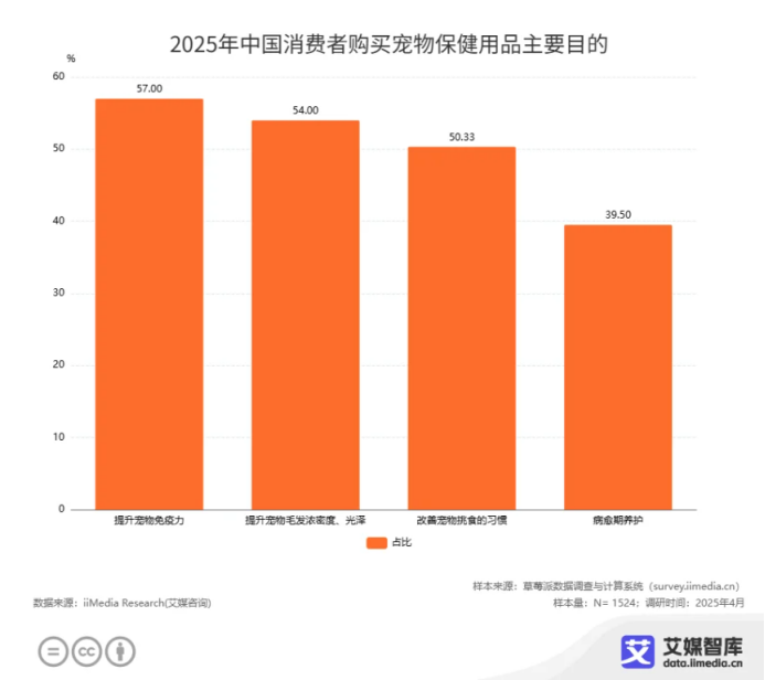 在这个蓬勃发展的巨大市场中,消费者的需求正变得前所未有的具体和清晰。iiMedia Research(艾媒咨询)调研数据精准地揭示了驱动这一消费升级的核心动力——对宠物健康的极致关注。在2025年中国消费者购买宠物保健用品的主要目的中,“提升宠物保护力”以57.0%的占比高居首位,而紧随其后的便是“提升宠物毛发浓密度、光泽”,占比高达54.0%。宠主们的健康管理诉求已从泛泛而谈,延伸至包括毛发健康在内的具体、可视化的指标。健康的毛发不仅是美观的需要,更是宠物整体健康状况的外在体现,因而成为了超过半数宠主的主动、核心消费目标。