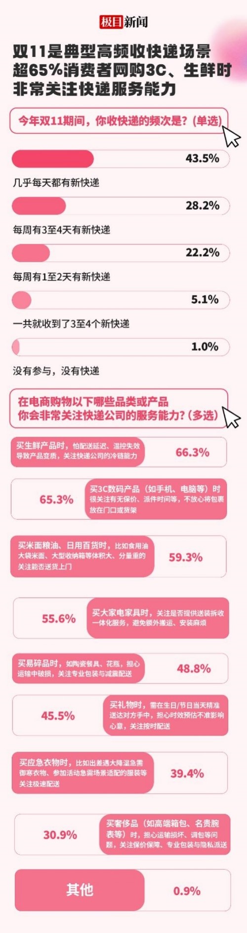 在购物品类选择上,日用百货以68.5%的购买率位居榜首,服饰鞋靴(56.2%)、米面粮油(55.2%)、生鲜食品(54.0%)紧随其后,跻身双11购物TOP4品类。值得关注的是,不同品类对快递服务的要求呈现显著差异,66.3%的消费者在购买生鲜产品时会重点关注快递公司的冷链能力,65.3%的消费者购买3C数码产品时格外在意保价服务与派件规范。