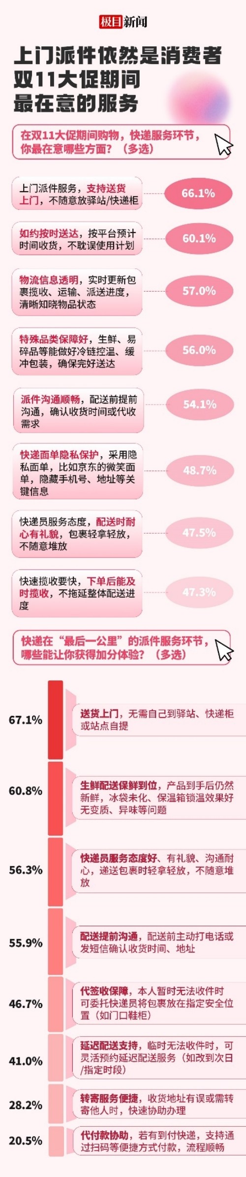在所有服务需求中,“送货上门”始终是消费者的核心诉求,也是行业服务满意度的关键风向标。调研显示,53.5%的受访者将“送货上门”列为快递服务的第一关键能力。双11大促期间,这一需求更为突出,66.1%的消费者明确表示最在意上门派件服务,60.1%的消费者重视配送时效,57.0%的消费者关注物流信息透明度。