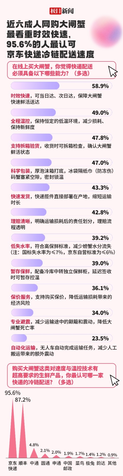 在各类生鲜产品中,大闸蟹对配送服务的要求最高。调研显示,58.9%的消费者网购大闸蟹时最看重配送时效;49.0%的消费者强调全程温控;47.8%的消费者要求支持拆箱验货。针对大闸蟹的配送需求,消费者对创新服务模式表现出高度认可,83.6%的消费者认为,快递公司将揽收环节前置,在产地周边或蟹商聚集地部署专业冷链车与揽收设备,能让自己更加安心。在品牌选择上,95.6%的消费者最认可京东快递的大闸蟹冷链配送能力。
