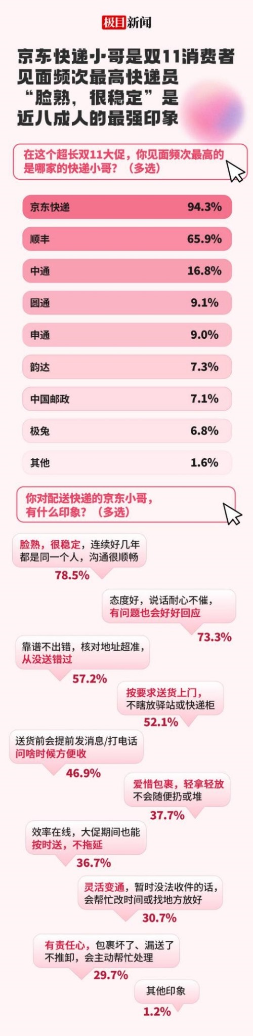 京东快递员能形成正向用户认知,核心是京东对快递员的稳定保障与模式创新,既通过提供五险一金等快递员权益保障提升人员稳定性,又以“固定小哥服务固定区域”模式让快递员熟悉消费者需求,并建立起“朋友般”的信任连接,让服务从标准化升级为有温度的个性化关怀,构筑起京东快递的差异化竞争优势。而本次双11快递服务满意度调研更明确了行业趋势:消费者需求已从“送达”向精准、可靠、贴心升级,送货上门、冷链物流、快递员稳定专业都是核心诉求,这也为行业发展升级再次指明方向。