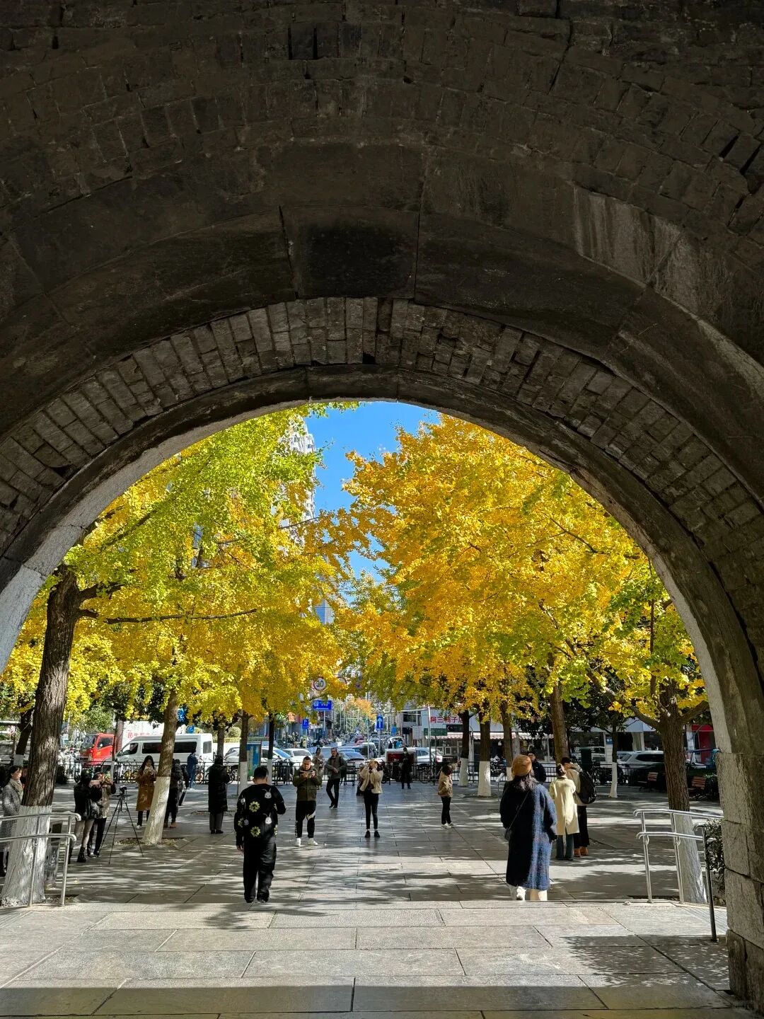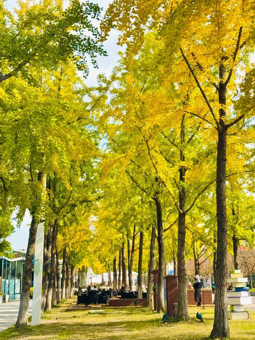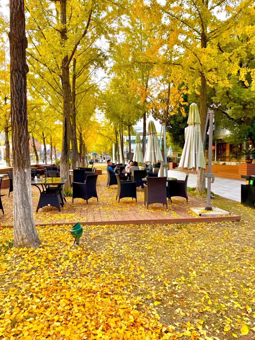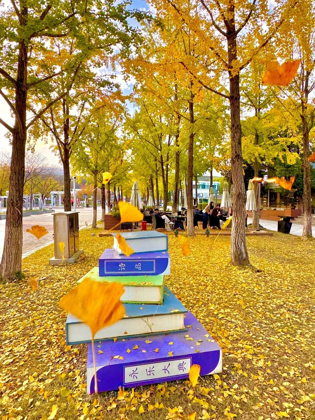 不同于别处的银杏,这里的银杏透着一股文艺与浪漫,黄灿灿的小扇子飘至地面,变成细碎的金黄。