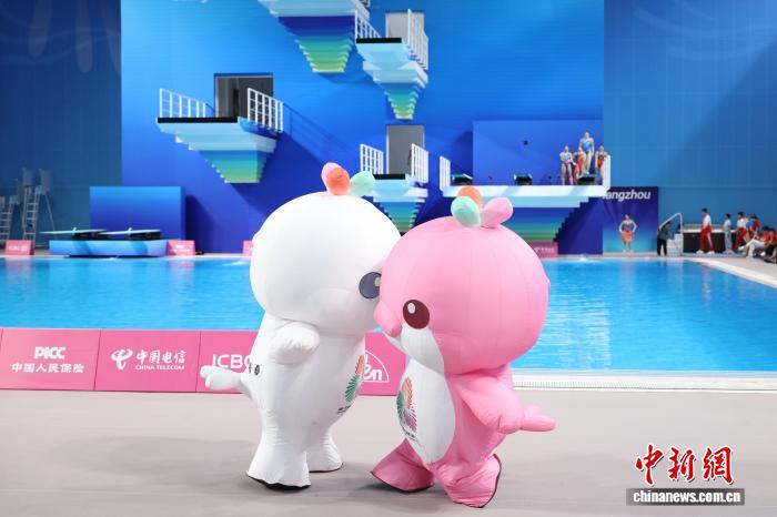 11月11日,第十五届全国运动会跳水项目女子3米跳板决赛在广东省奥体中心游泳跳水馆举行。图为比赛前,十五运会吉祥物带来暖场表演。 中新社记者 陈楚红 摄