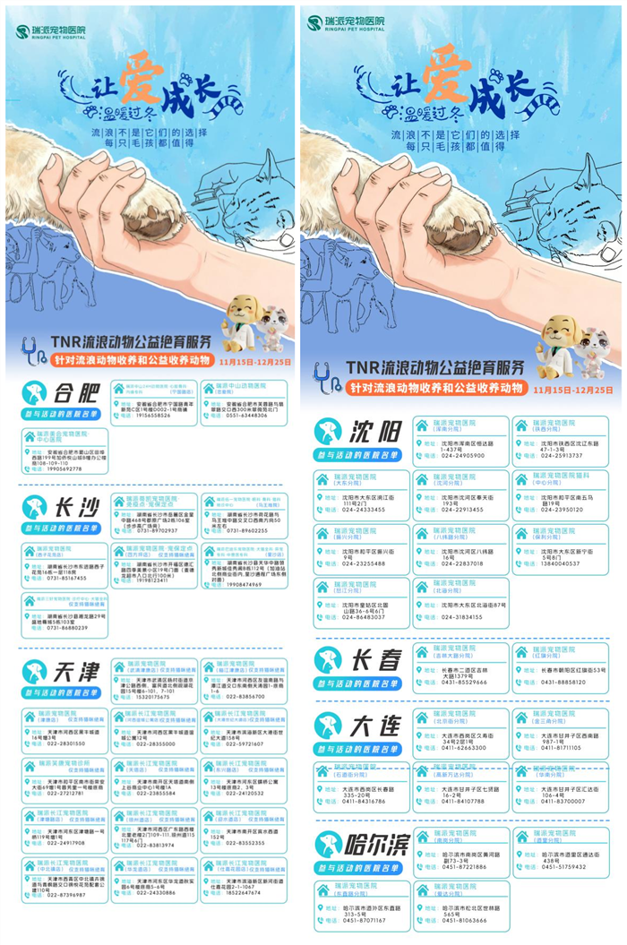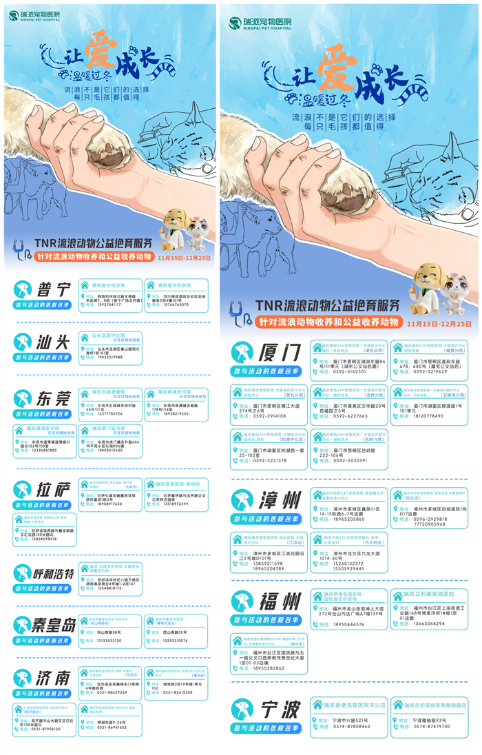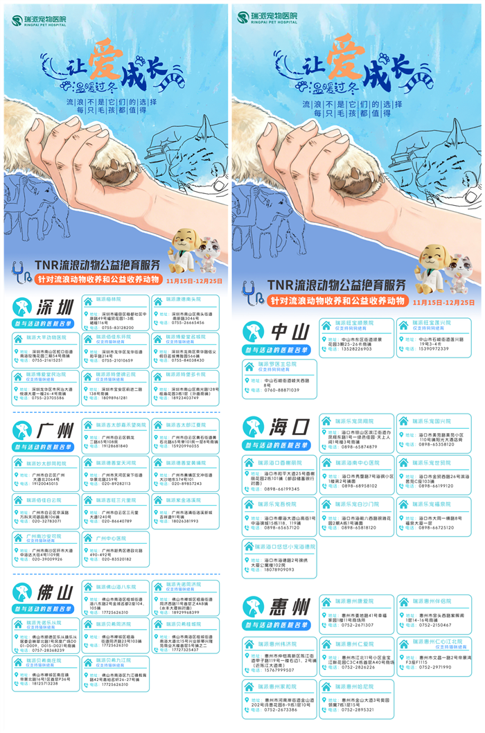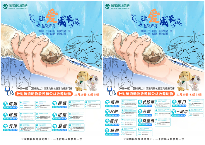 11月15日-12月25日,瑞派萌宠星球集结长春、长沙、大连、东莞、佛山、福州、广州、哈尔滨、海口、合肥、呼和浩特、惠州、济南、拉萨、宁波、普宁、秦皇岛、厦门、汕头、深圳、沈阳、天津、漳州、中山等城市的百余家瑞派宠物医院,共同发起“小流浪专享公益绝育活动”,为流浪动物开启专属福利绝育通道,用科学有效的方式从源头守护,许它们一个免于无序繁殖困扰的未来。