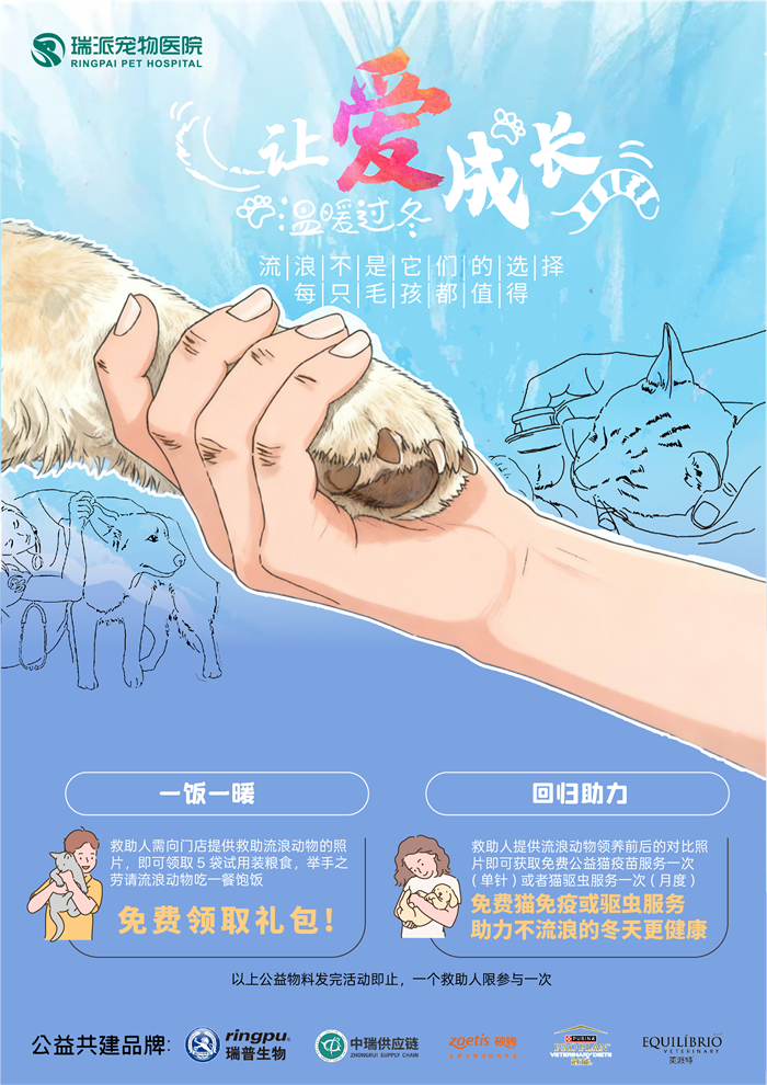 七年来,瑞派一直坚持发起“让爱成长,温暖过冬”流浪动物公益救助活动,每年都会提供暖心公益医疗,联合宠物行业优秀品牌,共同为流浪动物实施救助,陪伴它们温暖过冬。今年,瑞派也将联合瑞普生物、中瑞供应链、硕腾、冠能、英派特等宠物医疗品牌,共同向救助机构及社会爱心人士捐赠物资,向流浪街头的小动物们施以援手,将宠物健康福利视为己任,期待它们能够回归家庭,享受爱意满满的幸福生活,将爱的力量无限传递。