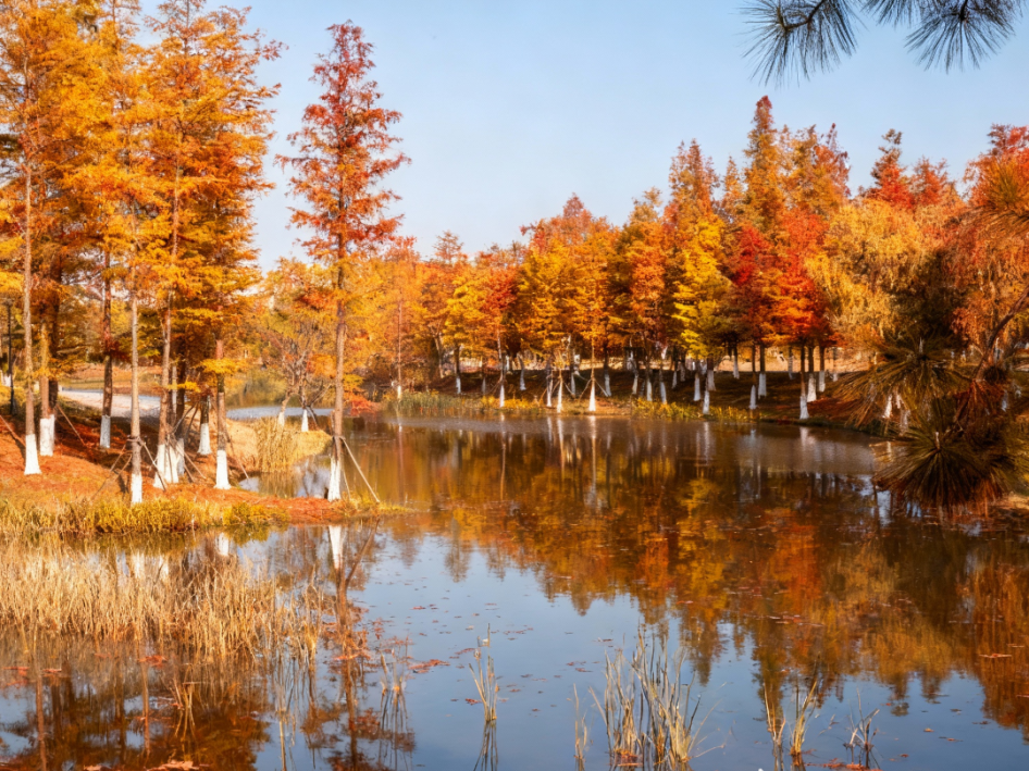初冬的仙林湖公园,好似被打翻的调色盘。沿着环湖步道漫步,岸边的落羽杉已褪去翠绿,换上了深褐与橙红交织的盛装,笔直的树干倒映在澄澈的湖水中,形成一幅绝美画卷。阳光透过枝叶的缝隙洒落,在步道上投下斑驳的光影,踩上去仿佛踏碎了满地星河。