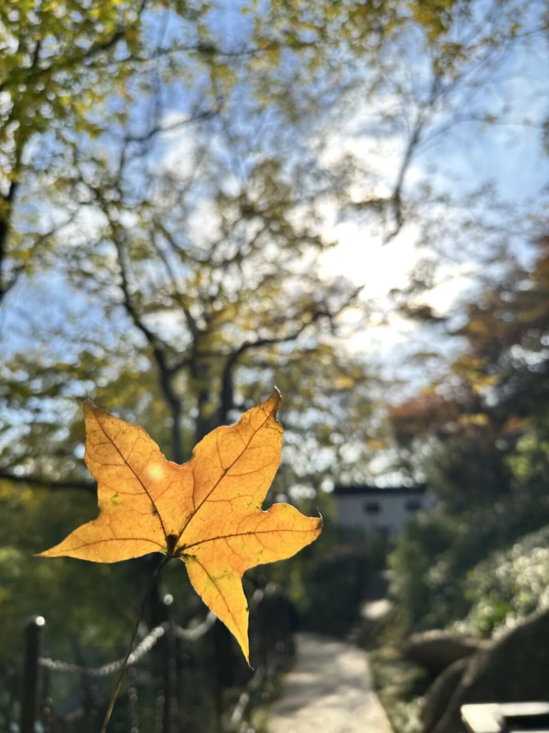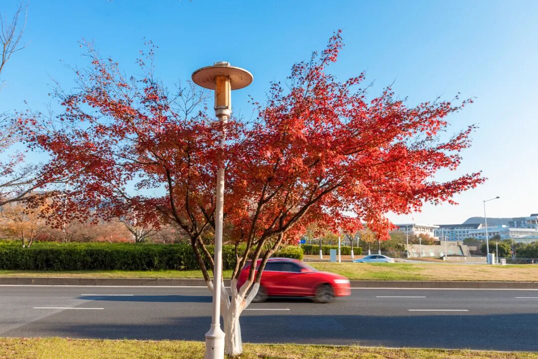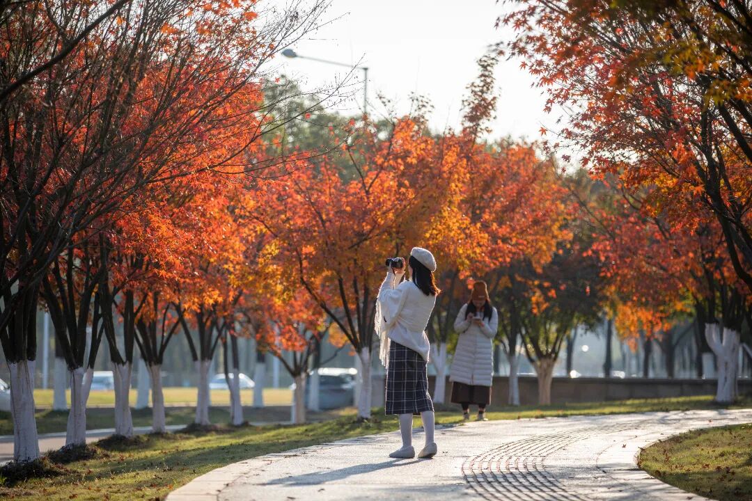初冬是羊山公园最富层次感的季节。刚出羊山公园地铁站,便能看见成片枫树沿着步道蜿蜒铺展,有的叶片红得浓烈似火,在阳光下泛着透亮的光泽;有的还红中带黄,像被染上了渐变的霞光。一阵风吹过,带下几片枫叶,落在石径、草丛间,走在其中,仿佛踏入了一条锦绣小路,每一步都带着冬日的诗意。
