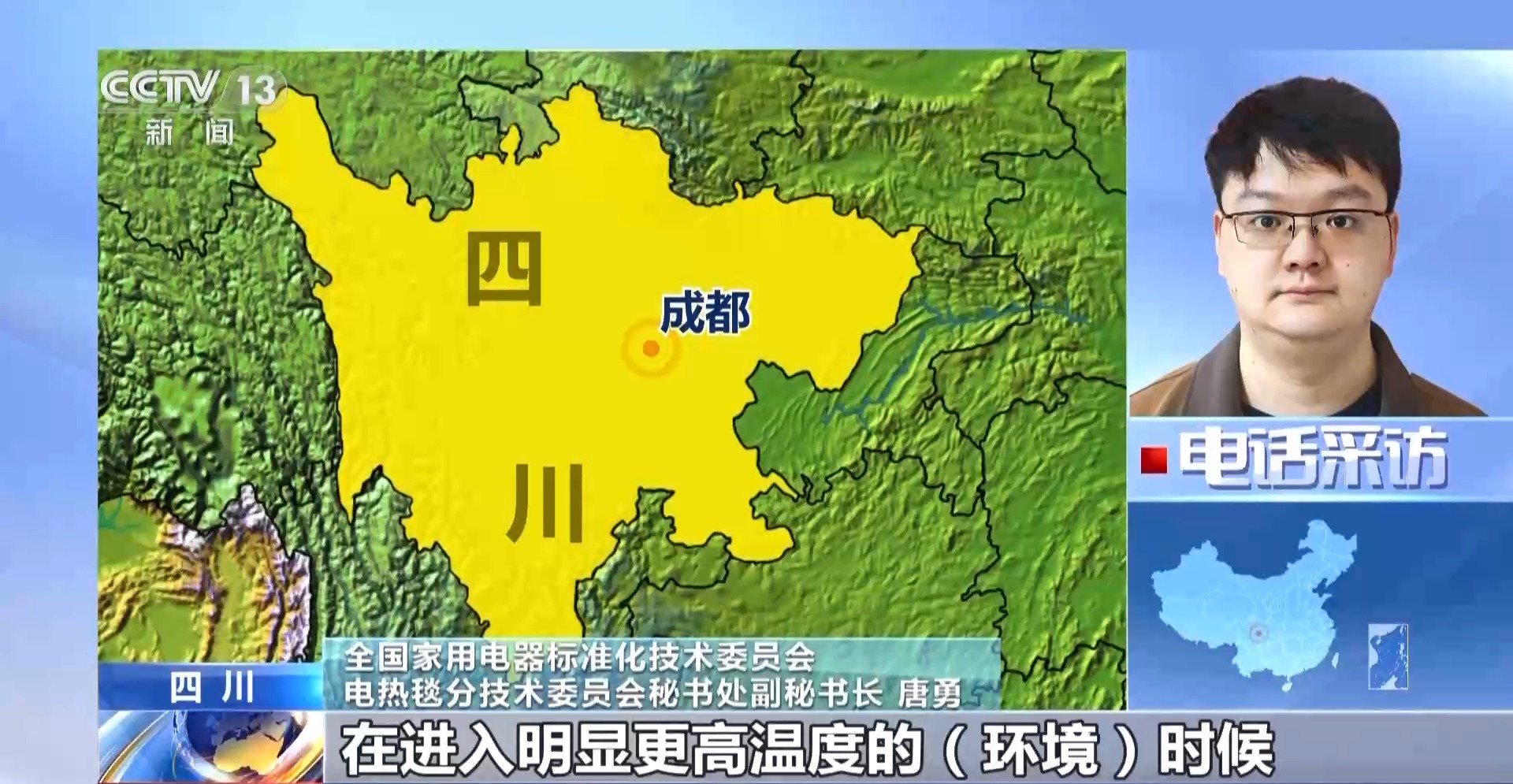 全国家用电器标准化技术委员会 电热毯分技术委员会秘书处副秘书长 唐勇:我们在使用发热衣的时候,在进入明显更高温度的环境时,要把发热衣的电断掉或者关掉,在潮湿的环境下尽量不要使用发热衣。