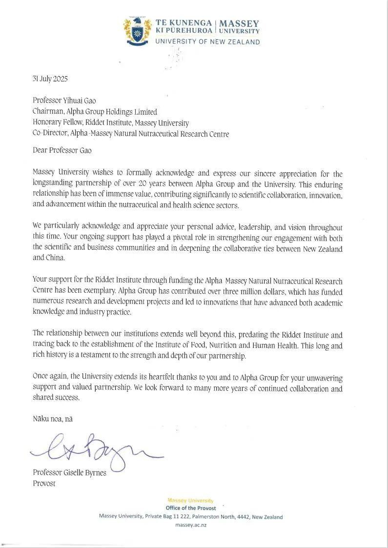 回溯合作历程,每一步都印刻着“创新”与“共赢”的印记。2002年,双方首次携手启动研究项目,安发将福建菌草技术引入新西兰,为当地生物资源开发开辟新路径,也为这段跨国合作埋下第一粒种子;2016年,“梅西大学安发天然营养研究中心”正式成立,成为双方产学研融合的核心载体——正如感谢函所提,安发累计投入的超300万纽币研发资金,已转化为一项项兼具学术价值与产业潜力的科研成果,为营养保健与健康科学领域的科研合作与创新发展作出了重要贡献。