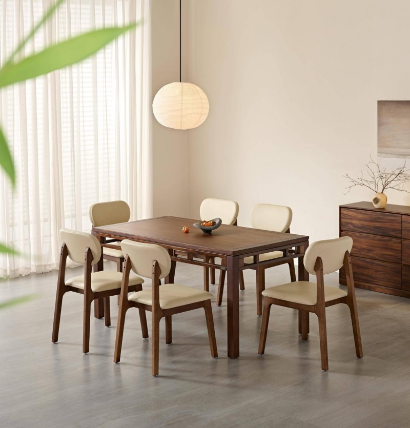 新中式餐桌,可伸缩结构桌面可方可圆,轻推即可完成切换,操作便捷,兼顾古典外观与日常实用性。檀木色餐桌主体搭配精致五金点缀,在稳重的中式风格中注入精致感。传统榫卯工艺结合现代设计,构建隐形力学骨架,带来稳固承重。