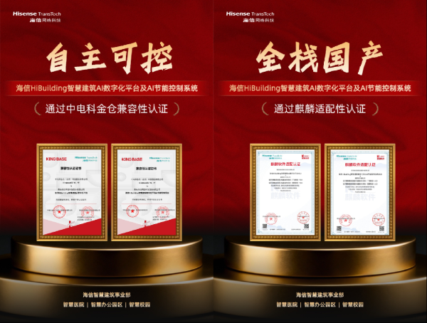 除信创认证之外,海信智慧建筑同步完三大头部厂商的认证证书:国产操作系统获得银河麒麟适配性认证、国产芯片获得赛宝及飞腾适配性认证、国产数据库获得中电科金仓兼容性认证,充分验证了解决方案的通用能力,将引领行业迈入“AI驱动、低碳引领、全面智能”的新时代。