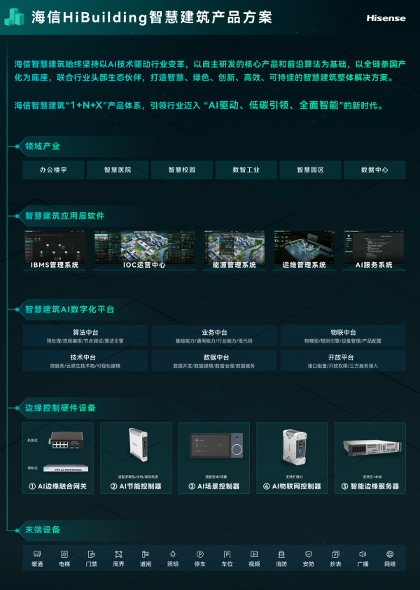 作为智慧建筑行业前沿的产品和综合解决方案服务商,海信智慧建筑依托自主研发的核心产品和前沿算法,以海信HiBuilding智慧建筑AI数字化平台为核心,搭建起全链条国产化、软硬件一体化的“1+N+X”智慧建筑解决方案,凭借高安全性、高适配性和高兼容性,为行业提供全面自主可靠的中国方案。