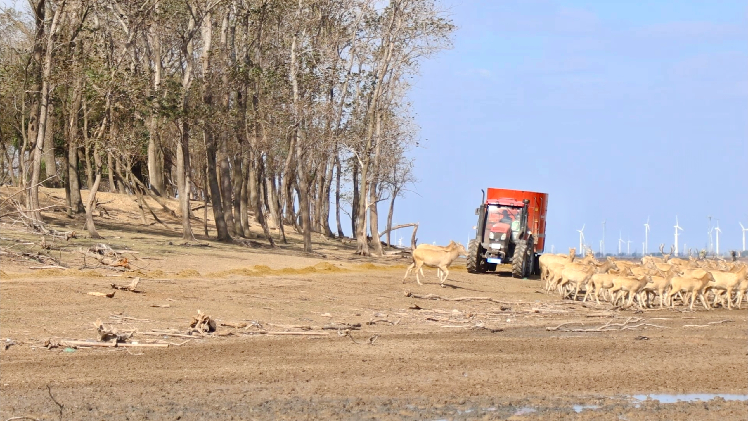 清晨,补饲车的轰鸣声划破宁静。大丰麋鹿国家级自然保护区办公室主任侯立冰指着车上的青贮饲料说:“这些玉米都是从附近农民那收的,成本低、质量高,农民增收,我们也实现了社区共建。”