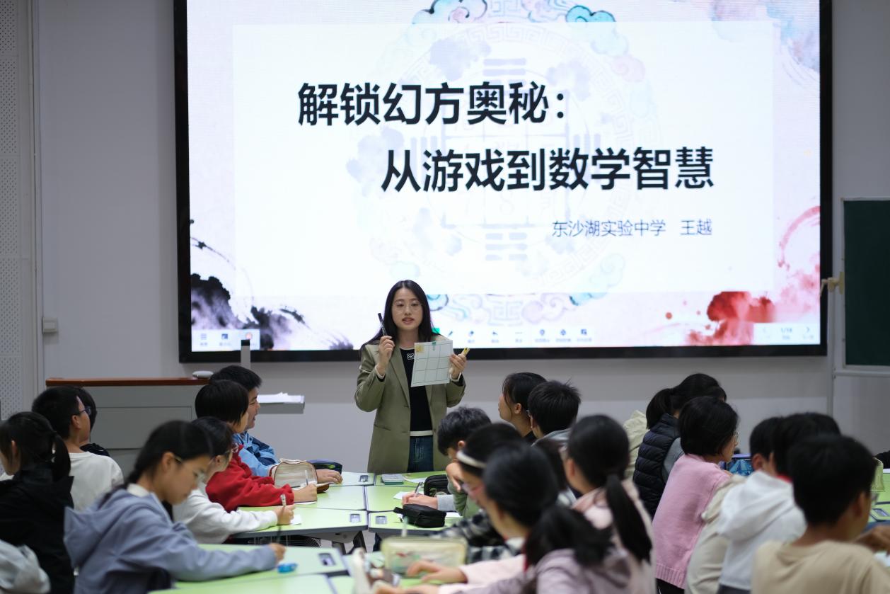 王越老师执教的《解锁幻方奥秘:从游戏到数学智慧》,以一段经典武侠剧《射雕英雄传》中黄蓉摆弄铜钱的影视片段点燃课堂氛围。七年级学子在文学情境中感受数学趣味,随后课堂聚焦三阶幻方构成规律展开深度探究,引导大家从感性认知逐步走向理性分析。课程特别引入AI智能程序,让学生亲手验证自己构建的幻方,在人机互动中体验传统智慧与现代科技的完美碰撞。这节融合人文、数学与人工智能的跨学科课堂,不仅让学生吃透幻方的数学本质,更有效培养了他们的计算思维与创新意识。