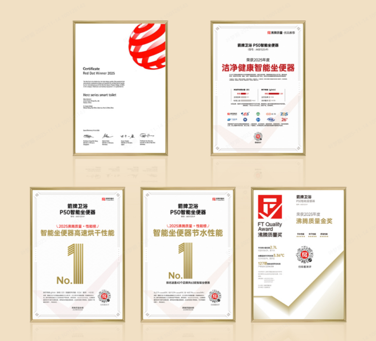 目前,该产品已荣获德国红点设计大奖,并在2025中国智能卫浴行业高峰论坛中获评“创新15大全链路洁净除菌系统产品”。在多项权威测评中,P50更斩获“智能坐便器高速烘干性能第一”与“节水性能第一”双榜首,成为注重健康群体的优先选择。