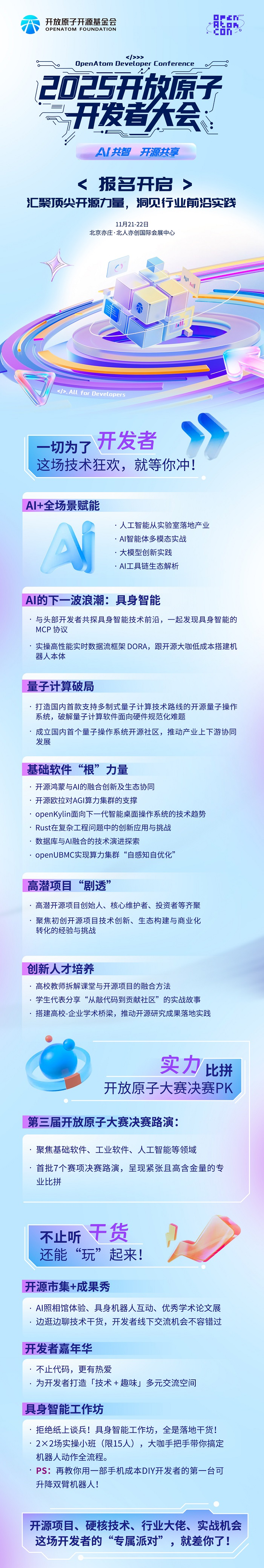 无论你是深耕某一技术栈的资深工程师,还是对开源充满好奇的技术新人;无论你是高校中渴望通过真实项目提升自我的学生,还是正带领团队探索商业化路径的初创项目负责人,2025开放原子开发者大会都是你不可错过的“年度加油站”。在这里,你不仅能听到技术大咖的干货分享,还能: