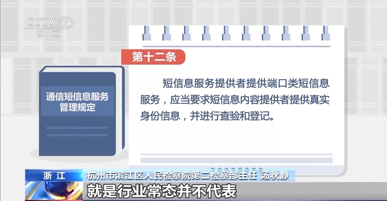 杭州市滨江区人民检察院第二检察部主任 汤秋静:行业常态不代表合法合规。国家法律法规有明文规定,对码号必须尽到足够的审核义务,不能够私自转让出租。电信业务营业者必须尽到相应的职责。