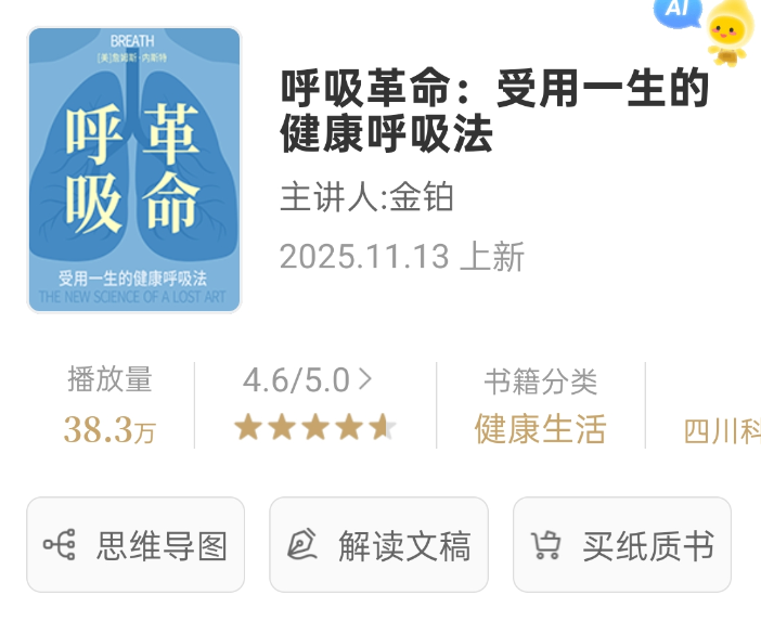 没人不会呼吸,但很少有人会正确呼吸,这是《呼吸革命》带给读者的全新认知。全运会赛场上,运动员的每一次起跑、冲刺都离不开高效呼吸的支撑,而对于普通运动爱好者来说,错误的呼吸方式往往是拖累运动表现的关键。在帆书APP非凡精读馆中,神经外科专家金铂医生戳破了“口呼吸=鼻呼吸”、“快呼吸=高效供氧”的常见误区,指出习惯性张嘴呼吸、打鼾等小毛病背后的健康隐患。书中分享的6种呼吸方法,每天只需3分钟练习,就能有效唤醒身体潜能。在帆书APP收听此书,通勤路上、运动热身时都能轻松学习,让呼吸从本能变成提升运动表现的秘密武器。
