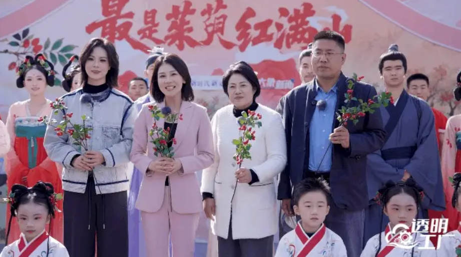 节目组嘉宾在茱萸林采摘山茱萸。