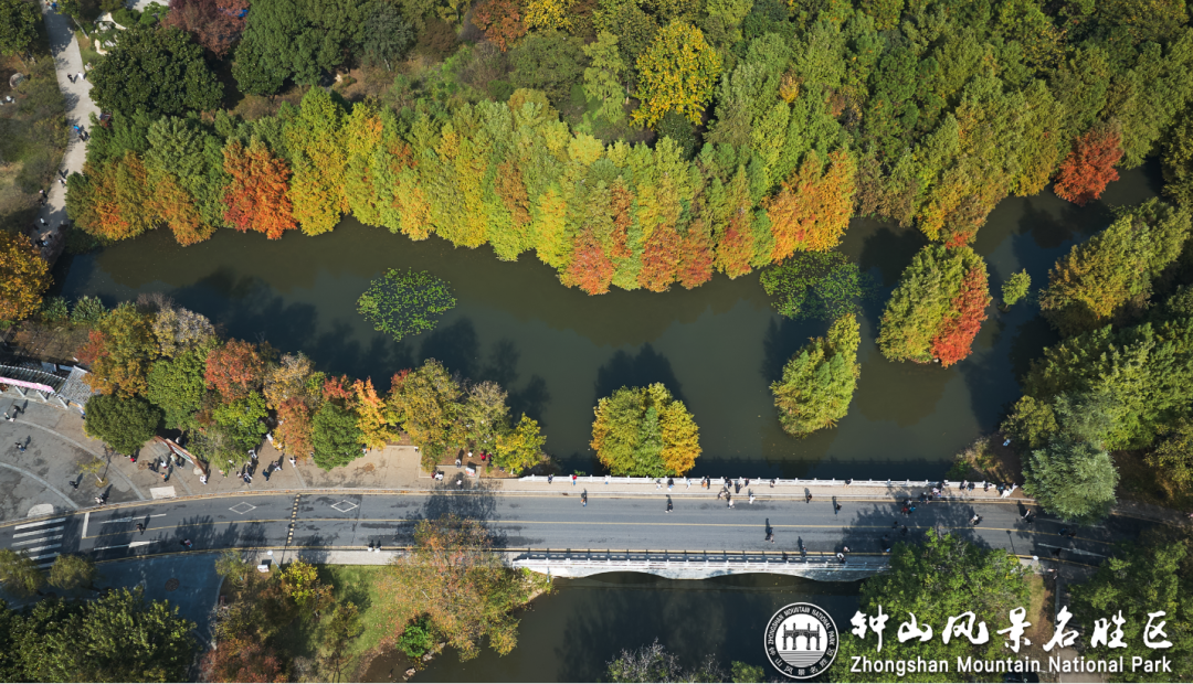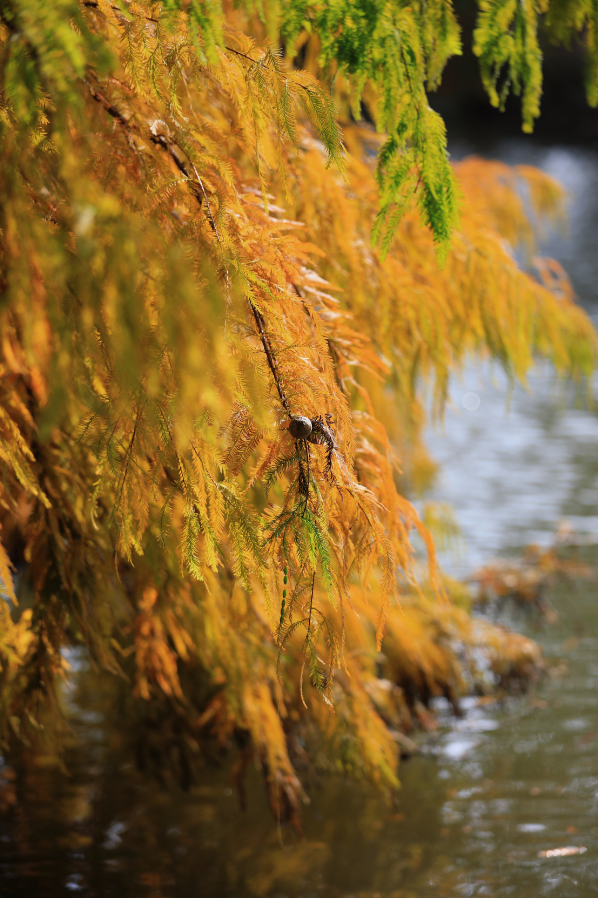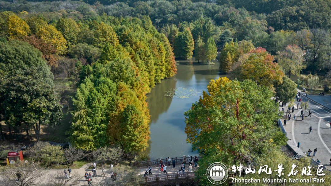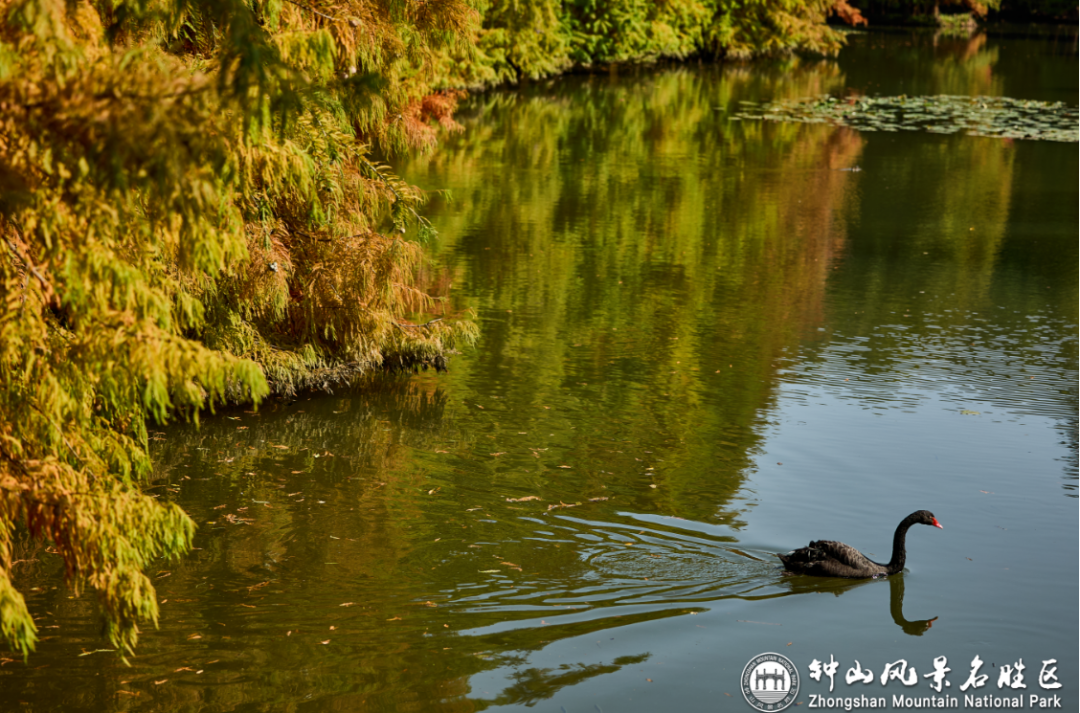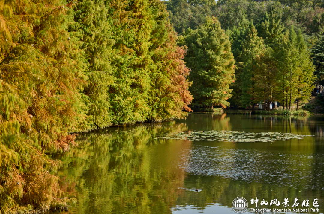 沿湖漫步,目光所及皆是惊喜。岸边垂向湖面的落羽杉已然褪去青涩,裹上蓬松的浅棕,在风中轻轻摇曳,与紫金山层林尽染的远景和谐相映。偶有天鹅划破湖面,激起层层涟漪,把倒映的天光云影搅成流动的色块,暖黄与湖绿碰撞出奇妙的化学反应,像极了印象派笔下的灵动笔触。